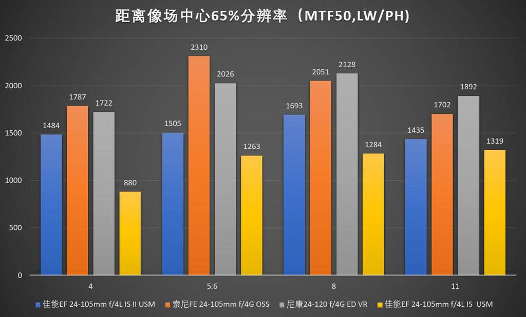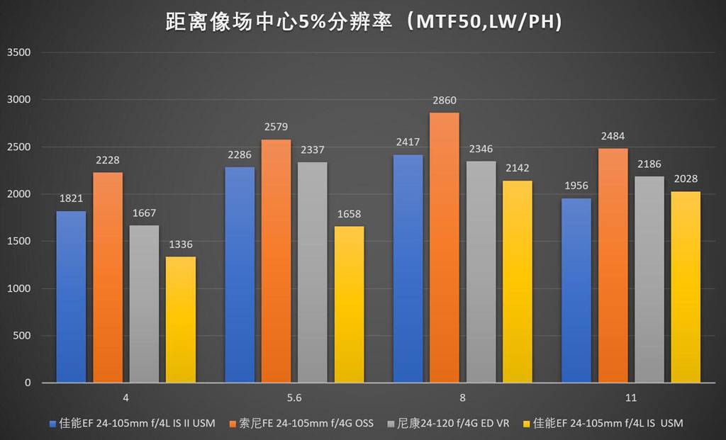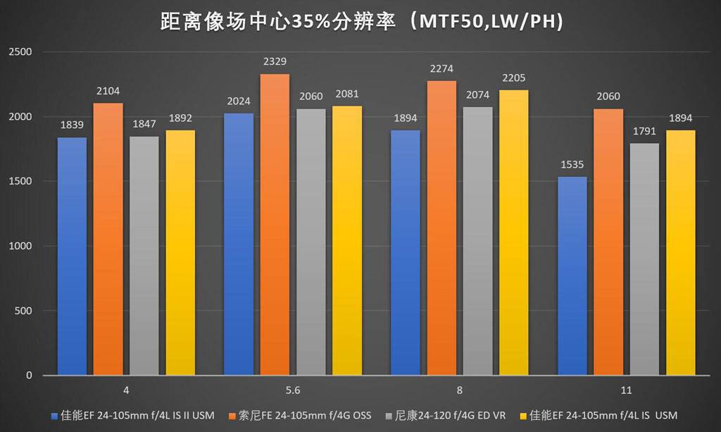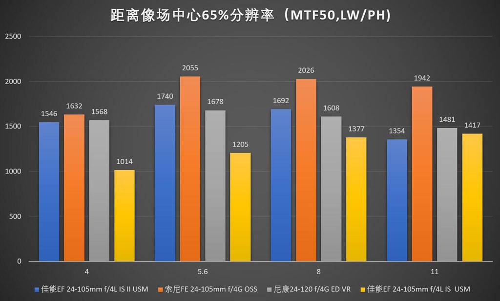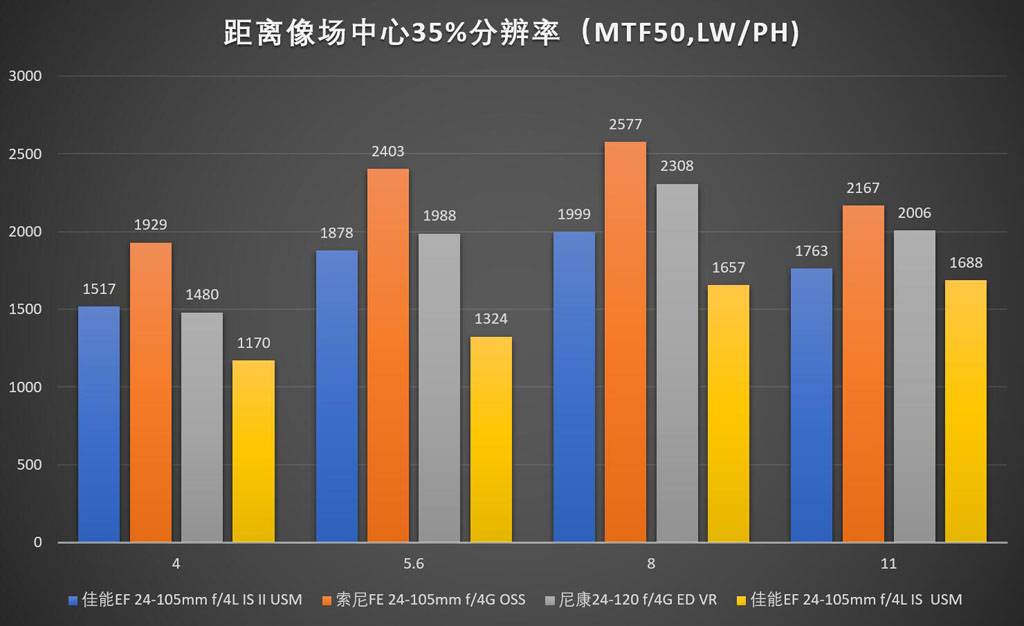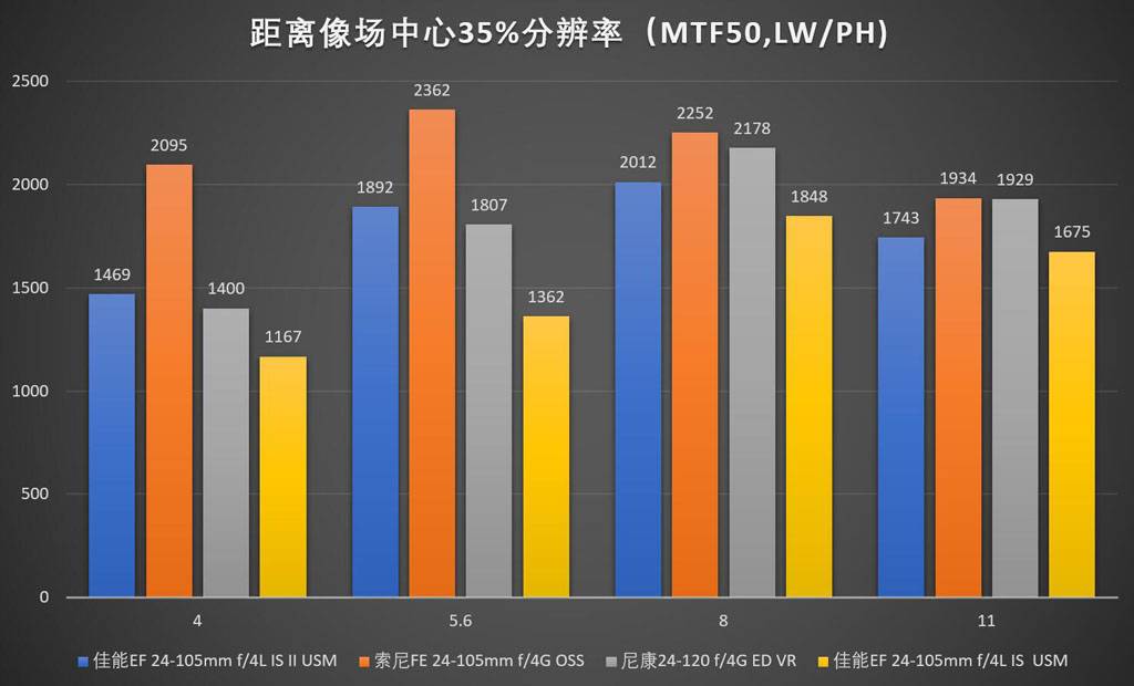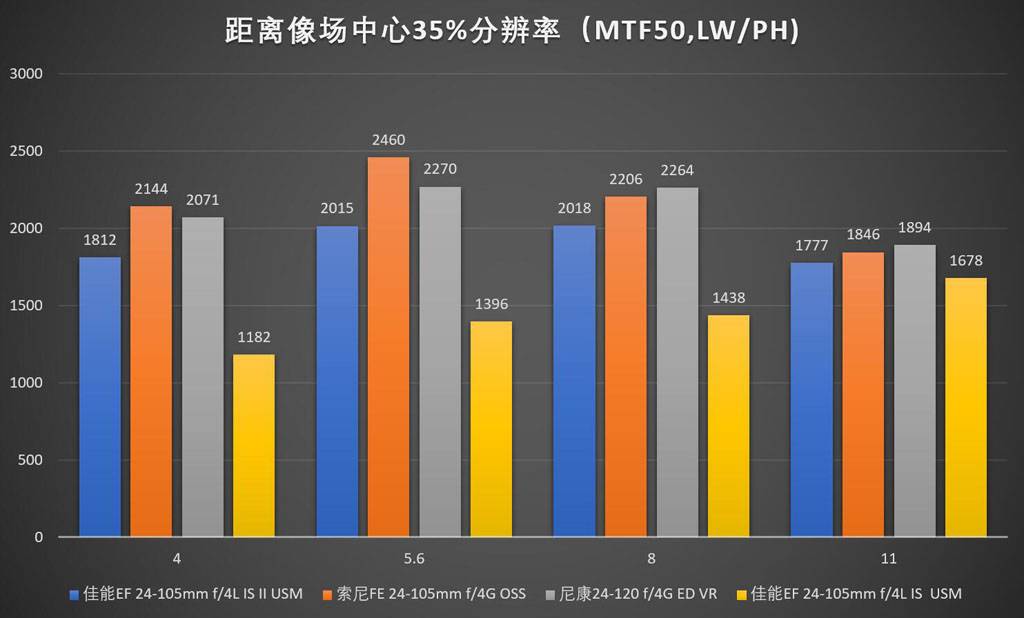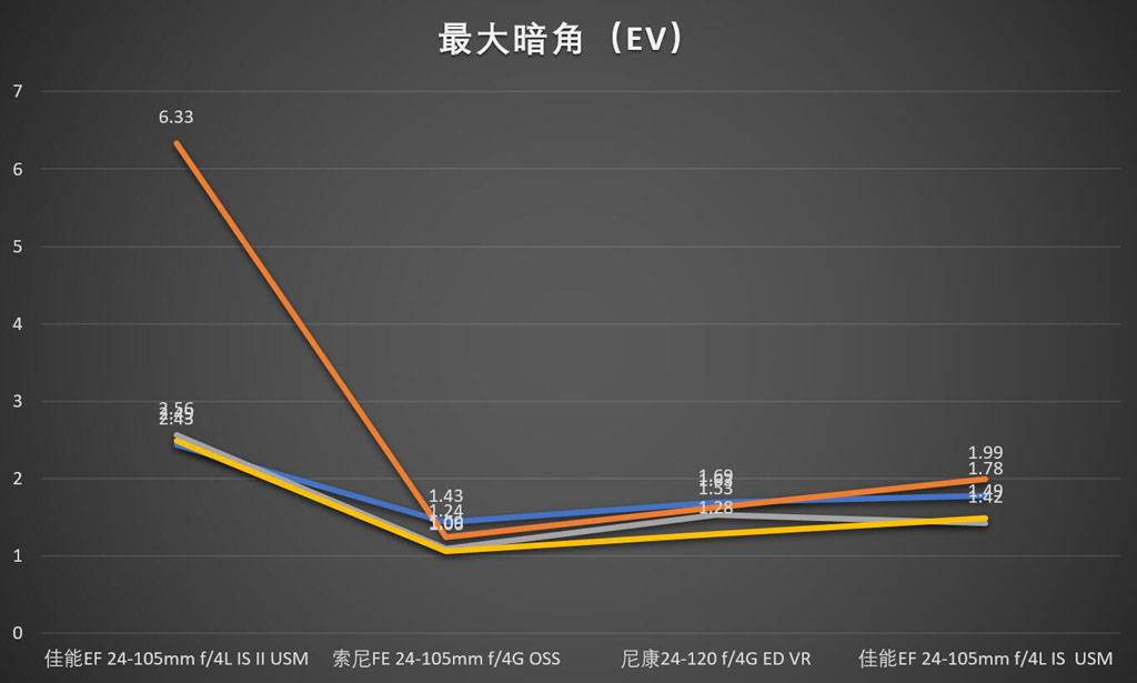 T值方面除了镜片和镀膜都比较古旧的老产品佳能24-105L一代之外,其它三支镜头的表现基本都一致。