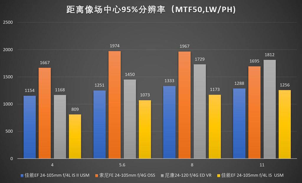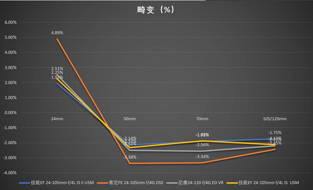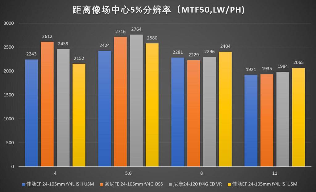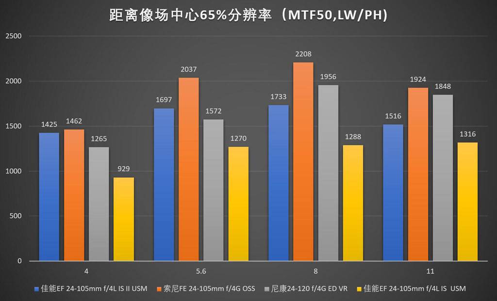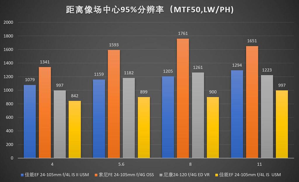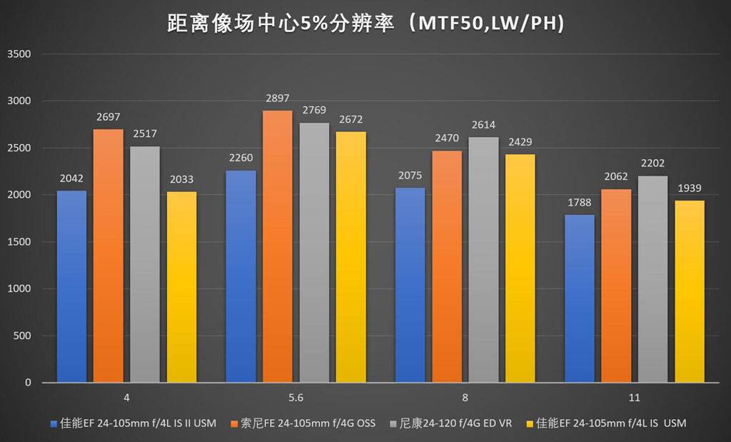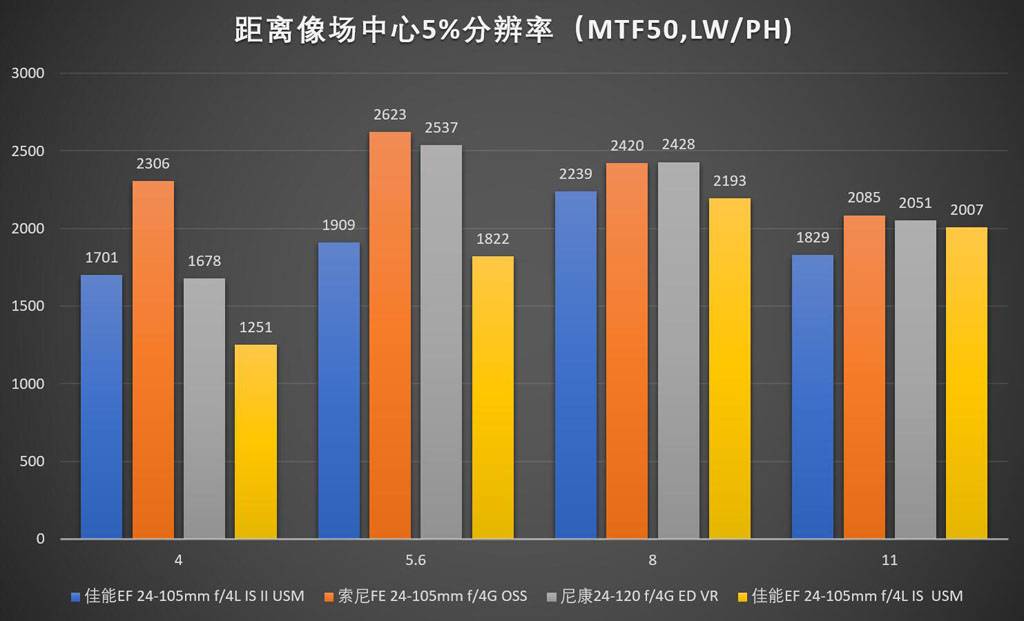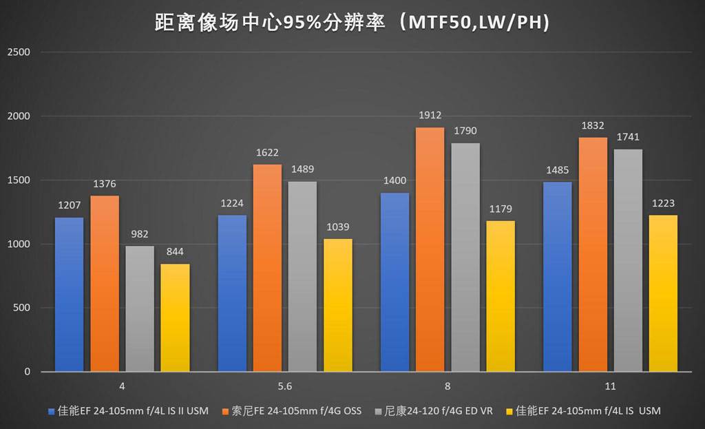 T值方面除了镜片和镀膜都比较古旧的老产品佳能24-105L一代之外,其它三支镜头的表现基本都一致。