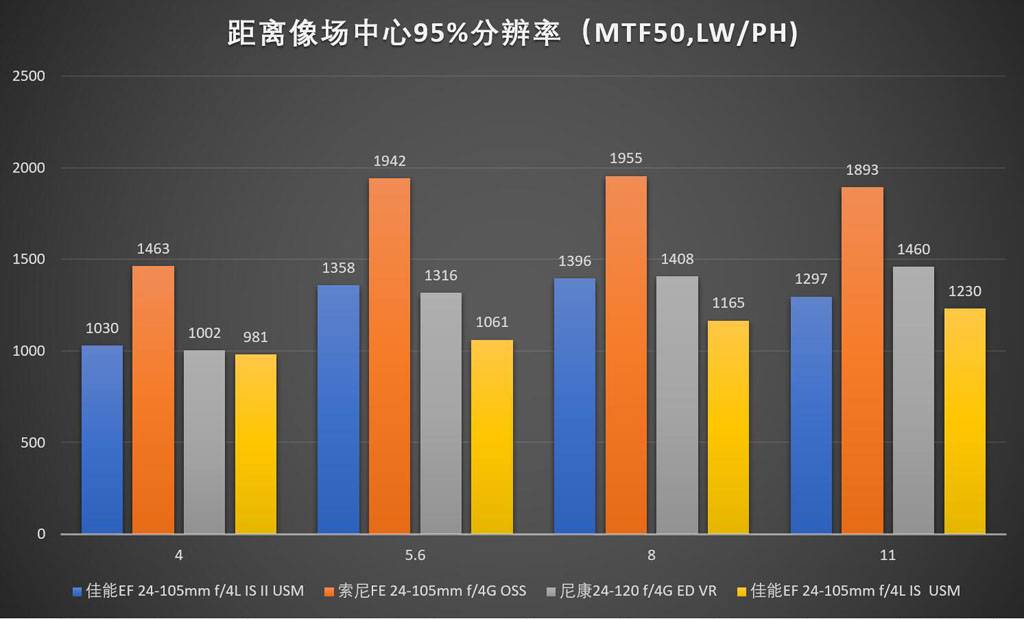 50mm焦距下除了佳能一代24-105L边缘画质迅速崩溃之外,其它三支镜头表现都还不错。索尼24-105G尤为抢眼,全开的边缘画质依然能有1500LW/PH以上,足以保证很好的实用性。佳能24-105L II相对于一代有所提升,但是不甚明显。至于尼康则是中规中矩。