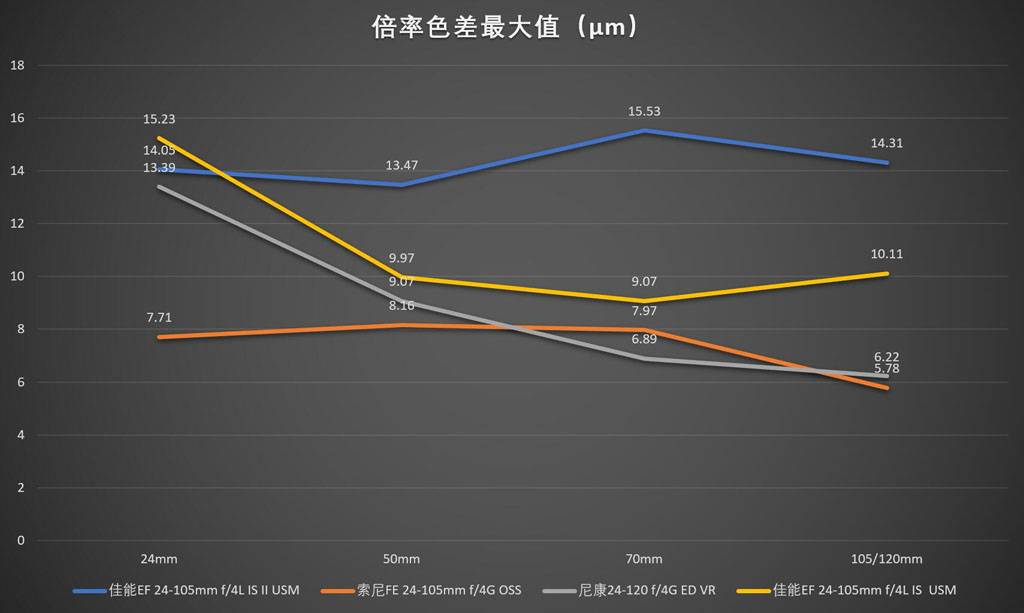 可以看到索尼24-105G除开分辨率优秀之外,倍率色差控制能力也是相当优秀的。而佳能的24-105L II相对一代来说反而在色散控制上有所倒退。尼康24-120G是典型的焦距越长色散控制越好,符合倍率色差的标准特征。