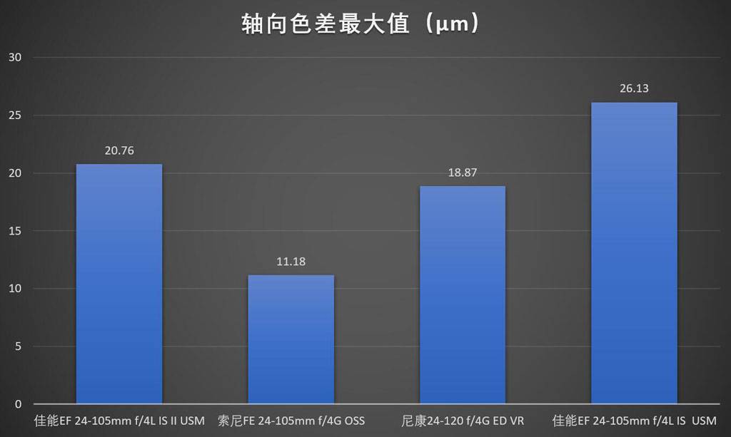 分为倍率色差(焦内色散)和轴向色差(焦外色散)两部分。考虑到这类镜头的实际使用场景,轴向色差只计算长焦端数值,倍率色差计算全焦段,所测值为其在像方焦平面(传感器平面)上的宽度(等效135全画幅的相当值)。