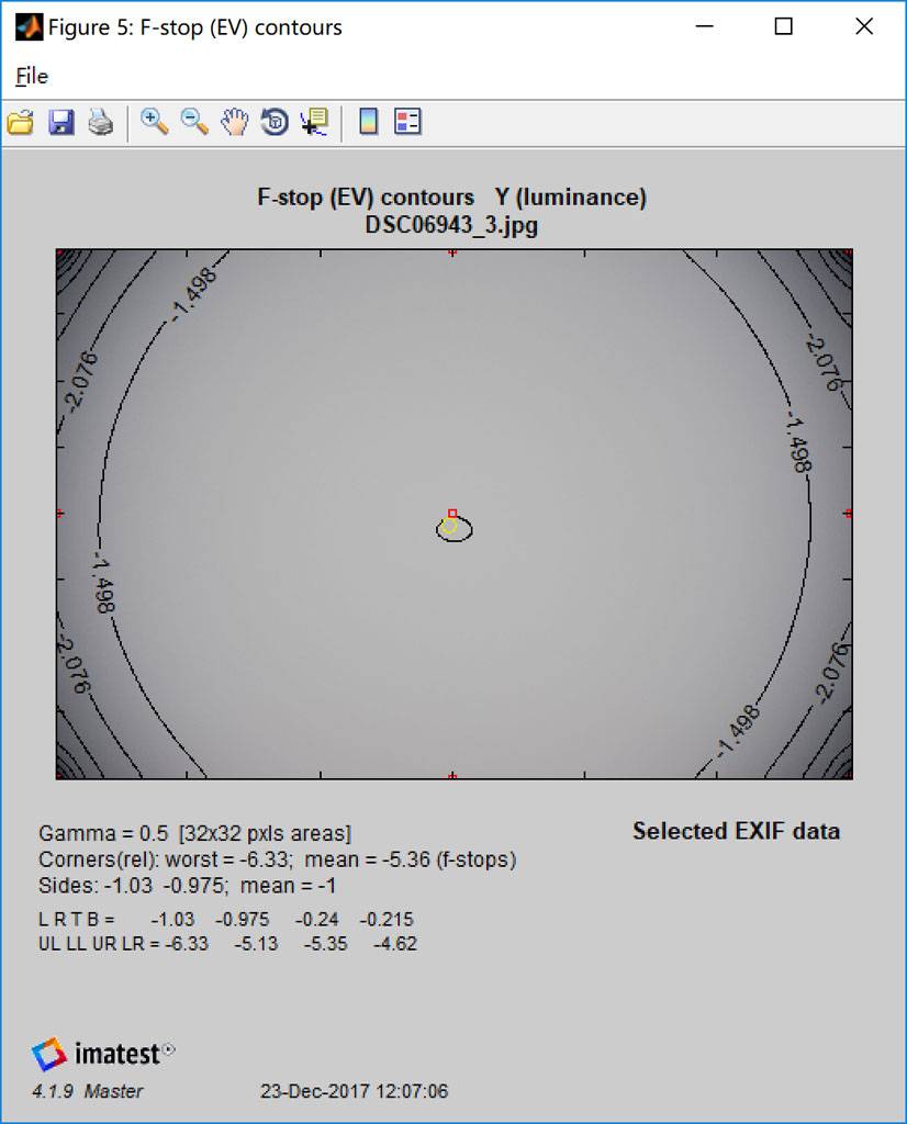 但是如果我们查看原始的Field-map F-Stop Contours,就可以发现索尼这个头实际上是在24mm端有点挡角,像场不太足额,暗角区域不大但是很硬,校正都不是很好校正: