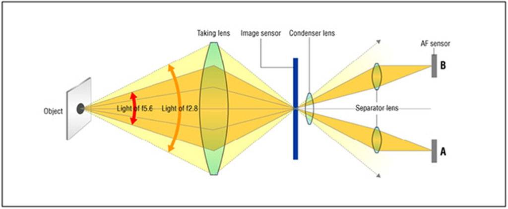 单反之所以需要不同的检测线来应对不同的光圈,主要还是因为二次成像透镜的分光机制,检测线并不能吃到镜头进入的全部光线。而无反的片上相位就没有这个问题,镜头入射的全部光线都可以照到片上相位点上来做对焦使用。当然因为实际镜头都有口径蚀,真实情况没有那么理想,不过相比单反要靠不同的检测线来区分相应的光圈,无反从f/1.2到f/11只要灵敏度跟上都可以做相位检测的特点在实用性上可以说是莫大的方便。同时可以利用大光圈的全部光束对焦,又进一步提高了(1)中所提到的精度。
