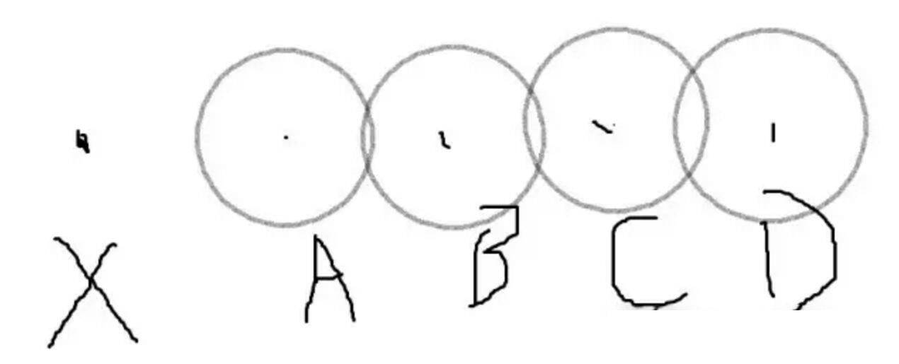 为了方便起见(写一堆二重积分可能很多人看着头都会大),我们把情况简化成一维情形,假设图像当中有一个定点X,受到来自同一条直线上A、B、C、D……的点扩散函数(灰圈)影响。很显然,离X越远的点,同样的虚化程度对X处成像效果的影响越小。