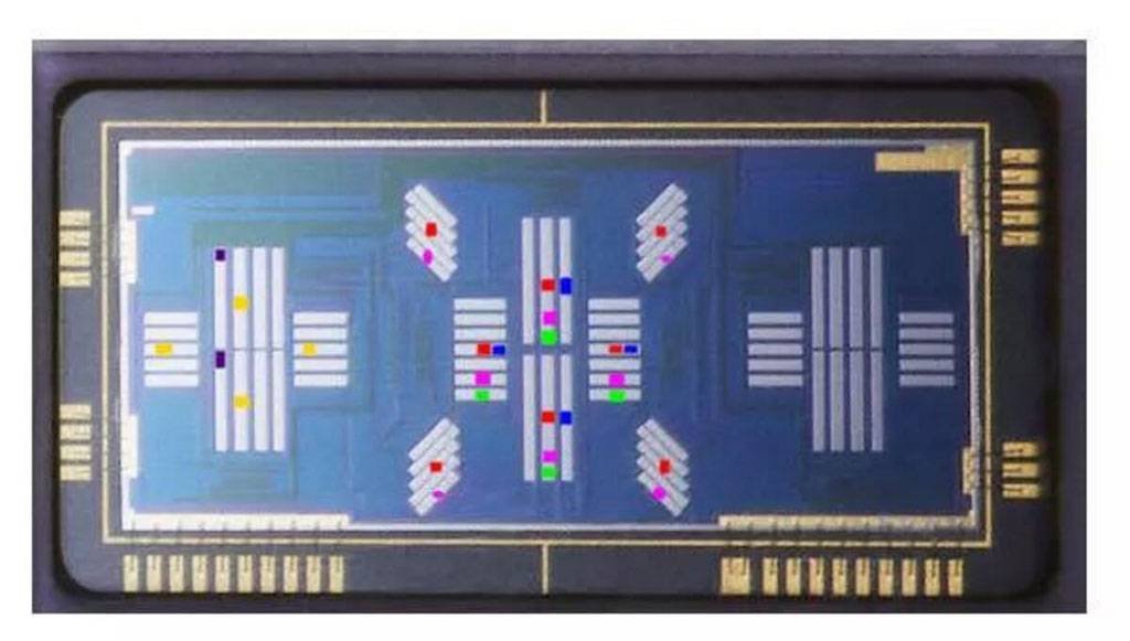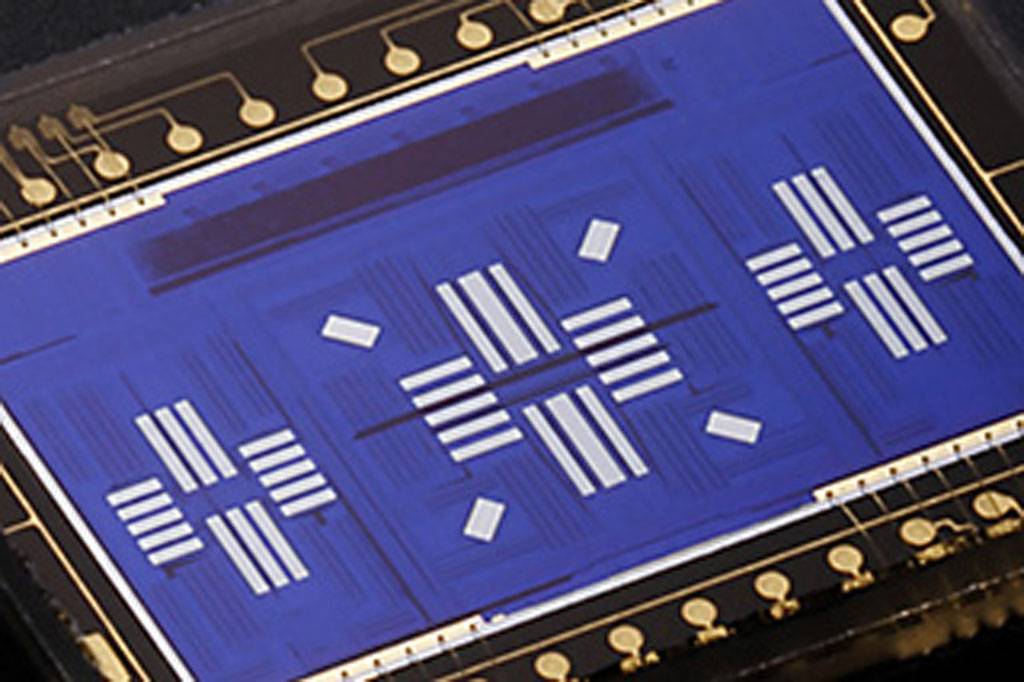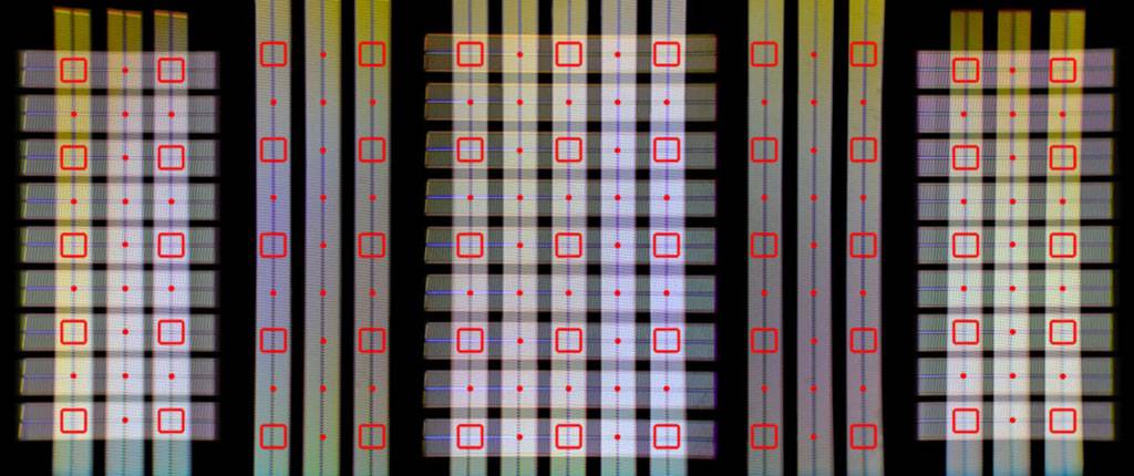 这个图就是上面这个对焦模块的f/8可用点,只剩下一个中心点,对比上面的对焦模块示意图不难猜测,那根加粗的检测线就是为这个f/8对焦准备的,增加进光量的同时缩小像素的径向长度。(对焦检测线的像素一般都不是方形,比如下面这张尼康Multi-Cam 20K对焦模块显微照片,明显扁的像素更适合用来做相位检测模块,检测线径向方向的像素密度高从而精度高,同时可以通过加宽法向宽度的办法来增加进光量提升灵敏度)