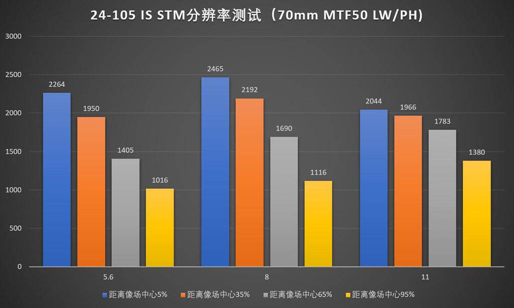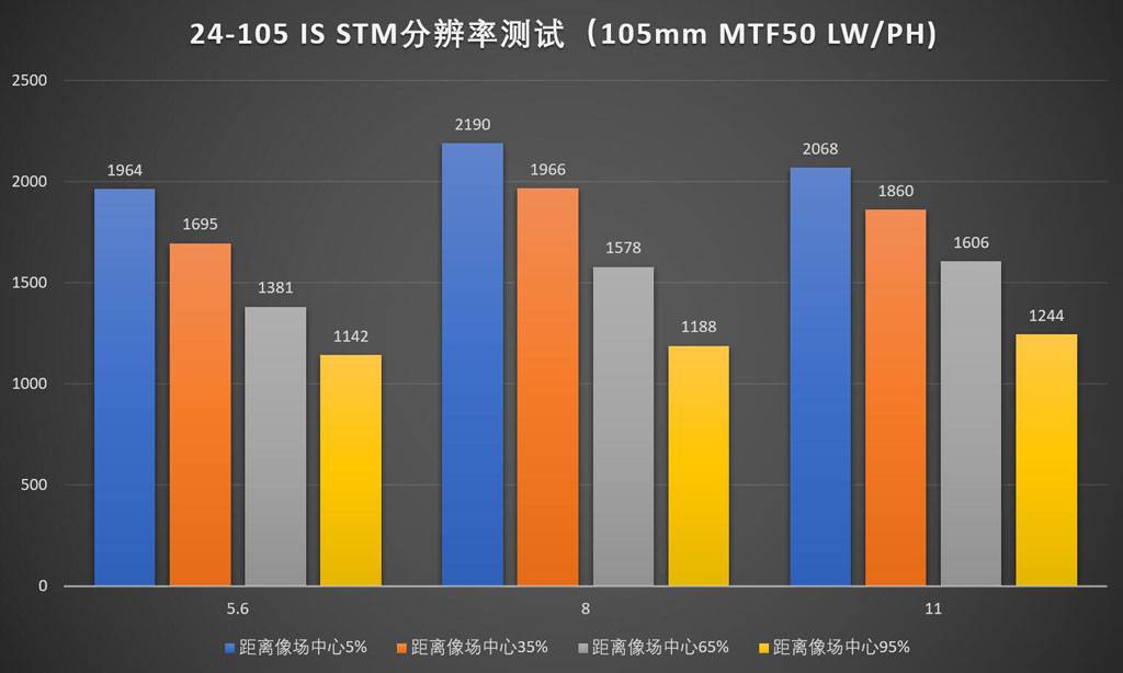 分辨率表现相比广角端有一点提升,边缘画质也超过了老的一代24-105L,不过整体来说依然不够好。小光圈表现依然不佳。