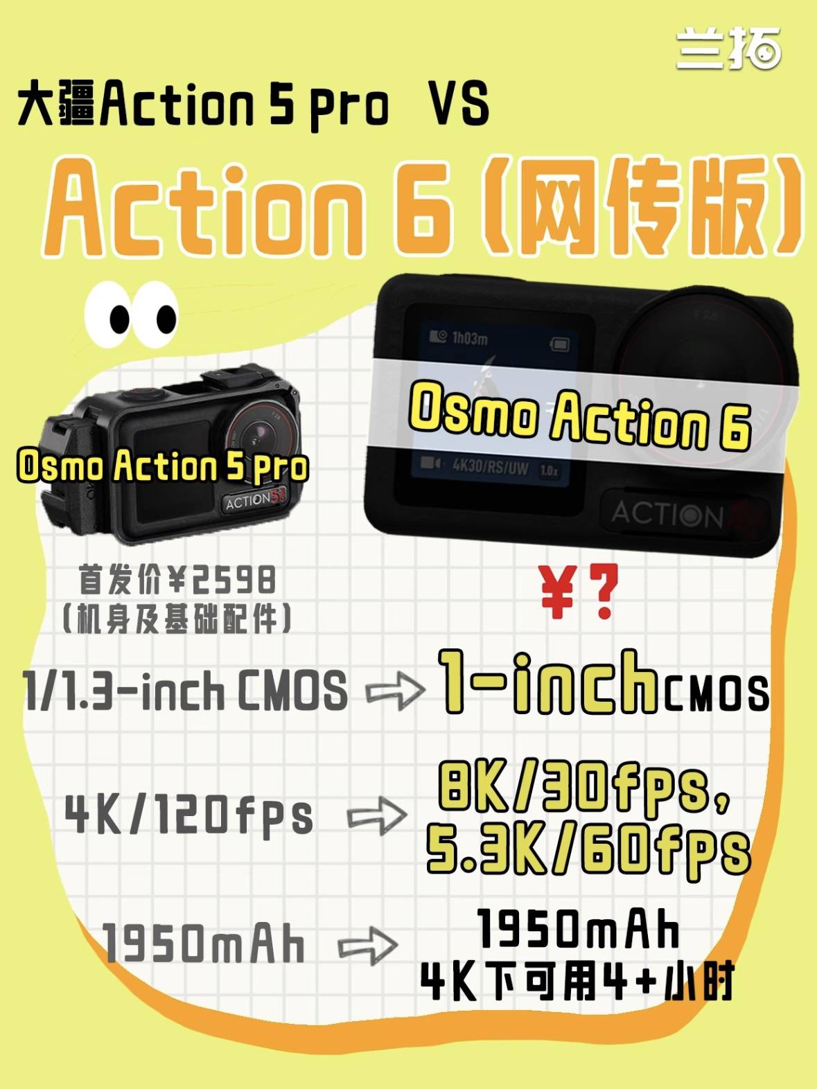 二、8K/60fps视频:Osmo 360已实现8K全景录制,Action 6或支持平面8K高帧率,裁切空间更自由。