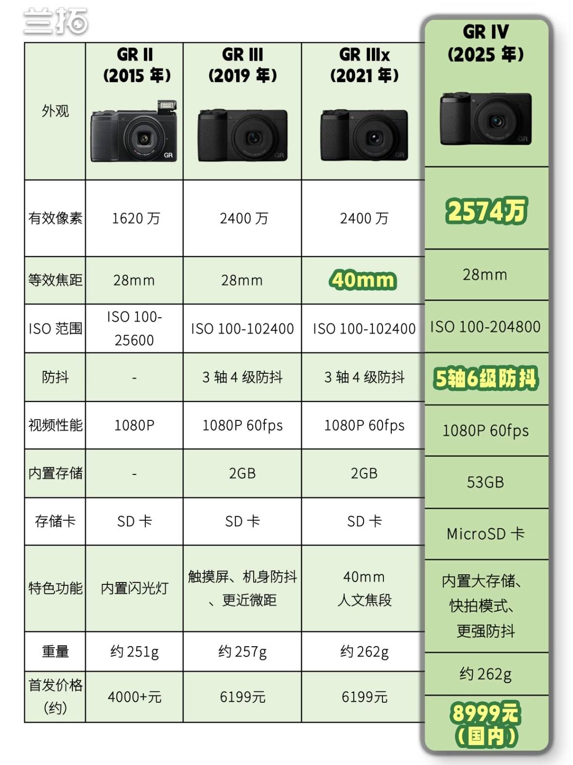GR4与前代GR3相比,涨幅高达2800元那么GR4到底升级了些啥?像素升级微乎其微,高感画质略有提升,但整体升级有限。但五轴防抖的加入,对于单手抓拍、弱光环境拍摄或是使用机内ND滤镜拍摄慢门来说,意味着更多的创作可能性。此外,GR4新增两种电影模拟模式,分别为黄色和绿色,风格化强烈,适合直出。