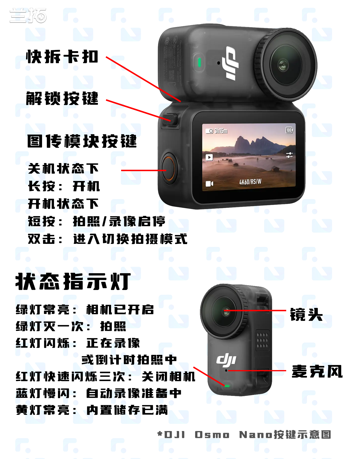 大疆Osmo Nano:大疆粉丝的心头好!体积控制优异,1/1.3英寸大底,夜景表现不错!照片方面,支持 JPEG 和专业的 RAW格式。视频方面,可拍4k60p视频,支持10-bit D-Log M模式,如果对视频画面的色彩、动态范围和夜景表现有很高要求,Osmo Nano是首选。同时自带内存,还能直连DJI麦克风,生态体验加分!