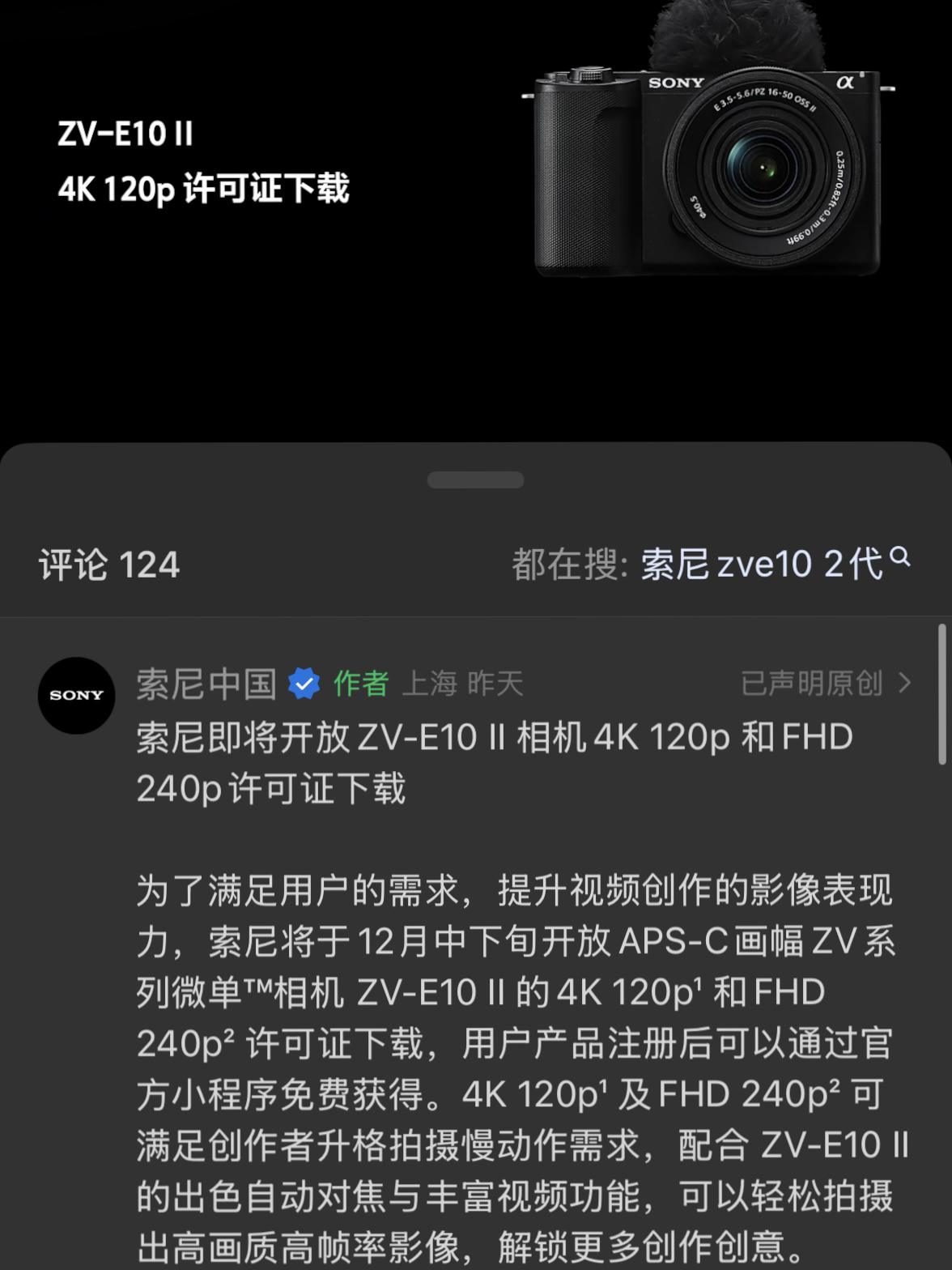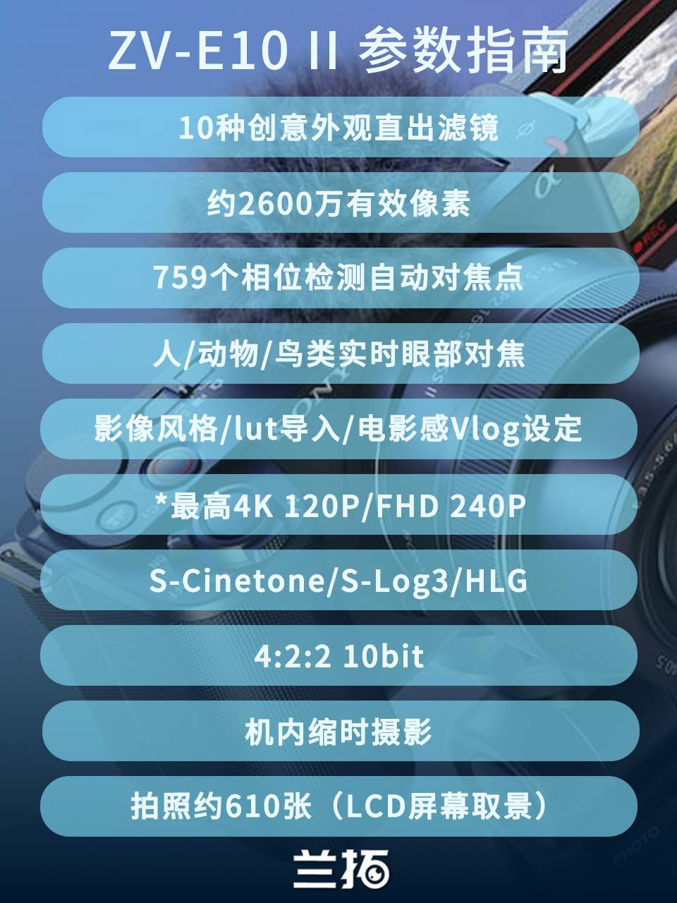 索尼近日宣布即将为入门级APS-C微单ZV-E10 II带来一项基于视频规格的免费升级:用户在本月下旬通过官方免费授权,即可解锁4K 120p高帧率,让这台主打视频的入门级微单在慢动作表现上再进一步,实用性大幅提升。作为兰拓热租的入门级机型,其实我们一直觉得ZV-E10 II本身就属于“很能打”的视频微单。