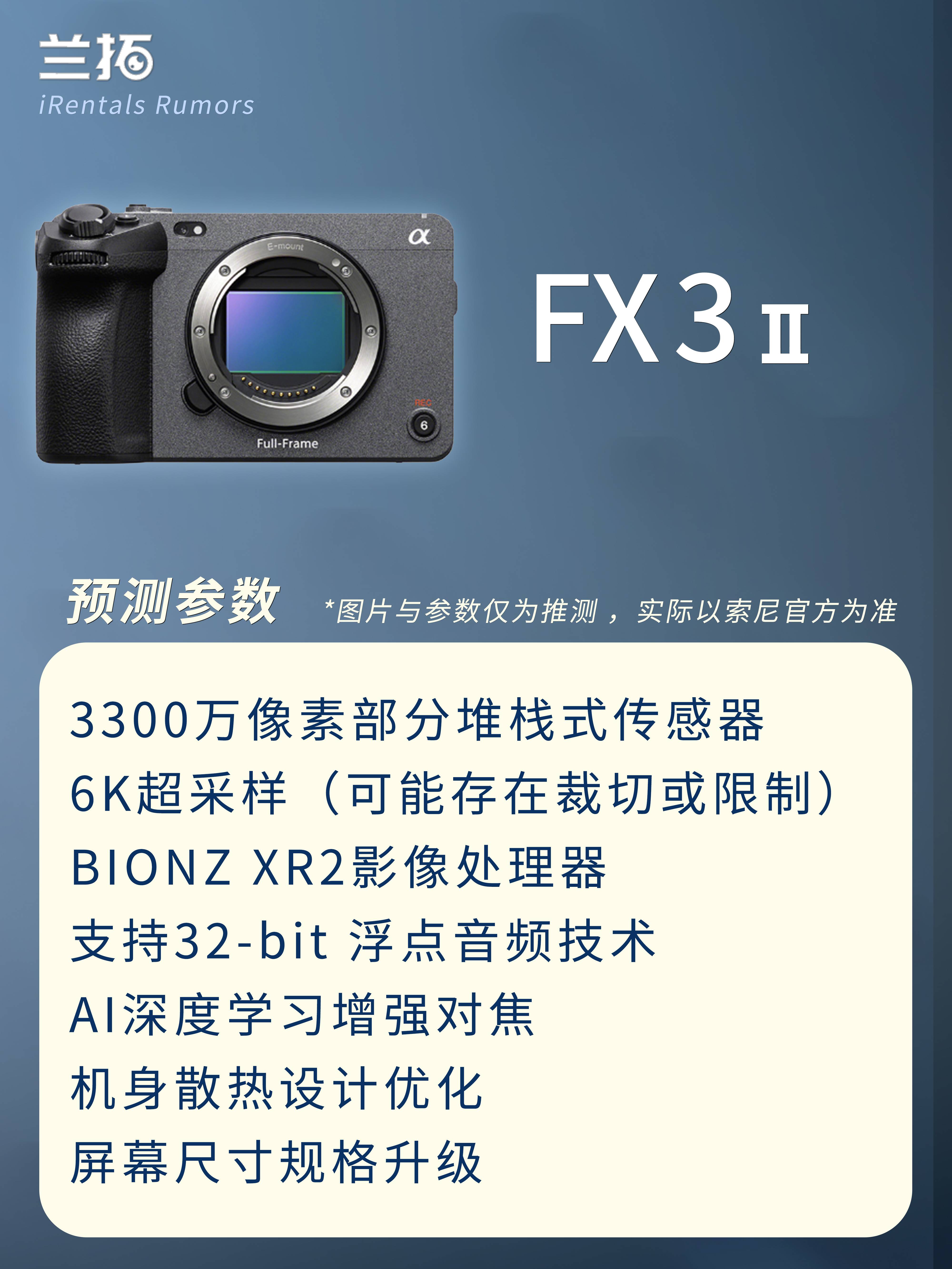 其次是FX3 II,作为索尼电影机体系里非常经典且相对“入门”的一款机型,FX3 的定位和受众都很清晰,也确实到了该更新的时间点。主流的猜测是 FX3 II 可能会采用与 Alpha 7 V 同款的3300万像素部分堆栈式传感器,当然也不排除索尼在电影机线传感器上尝试其他方案,如果是全域快门安排上了,还能内置ND...那可能会说在做梦了;