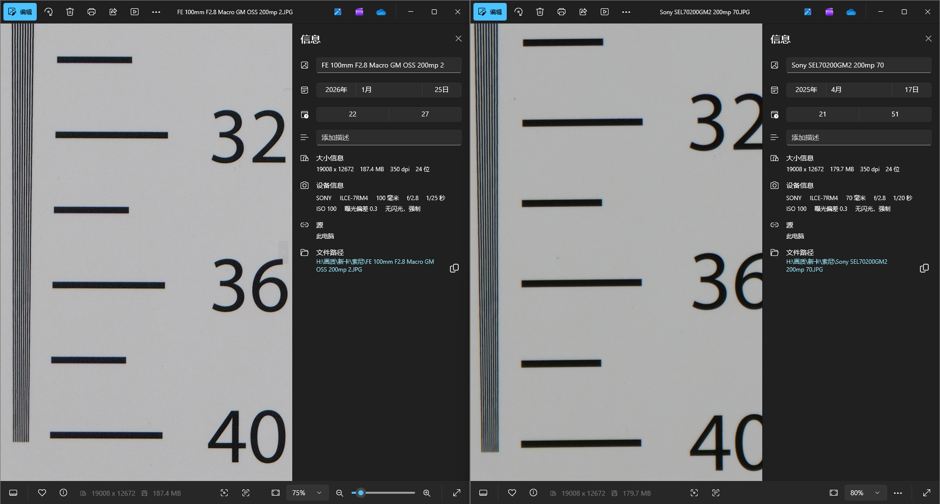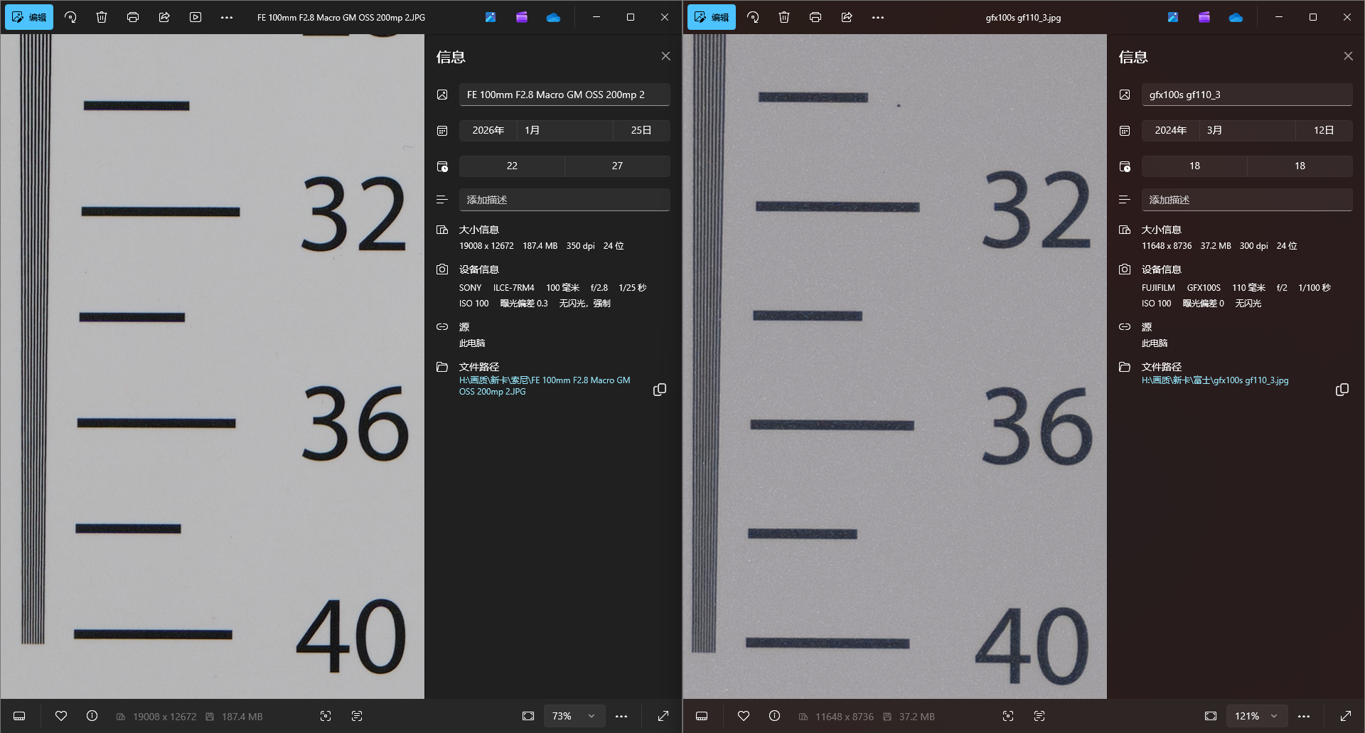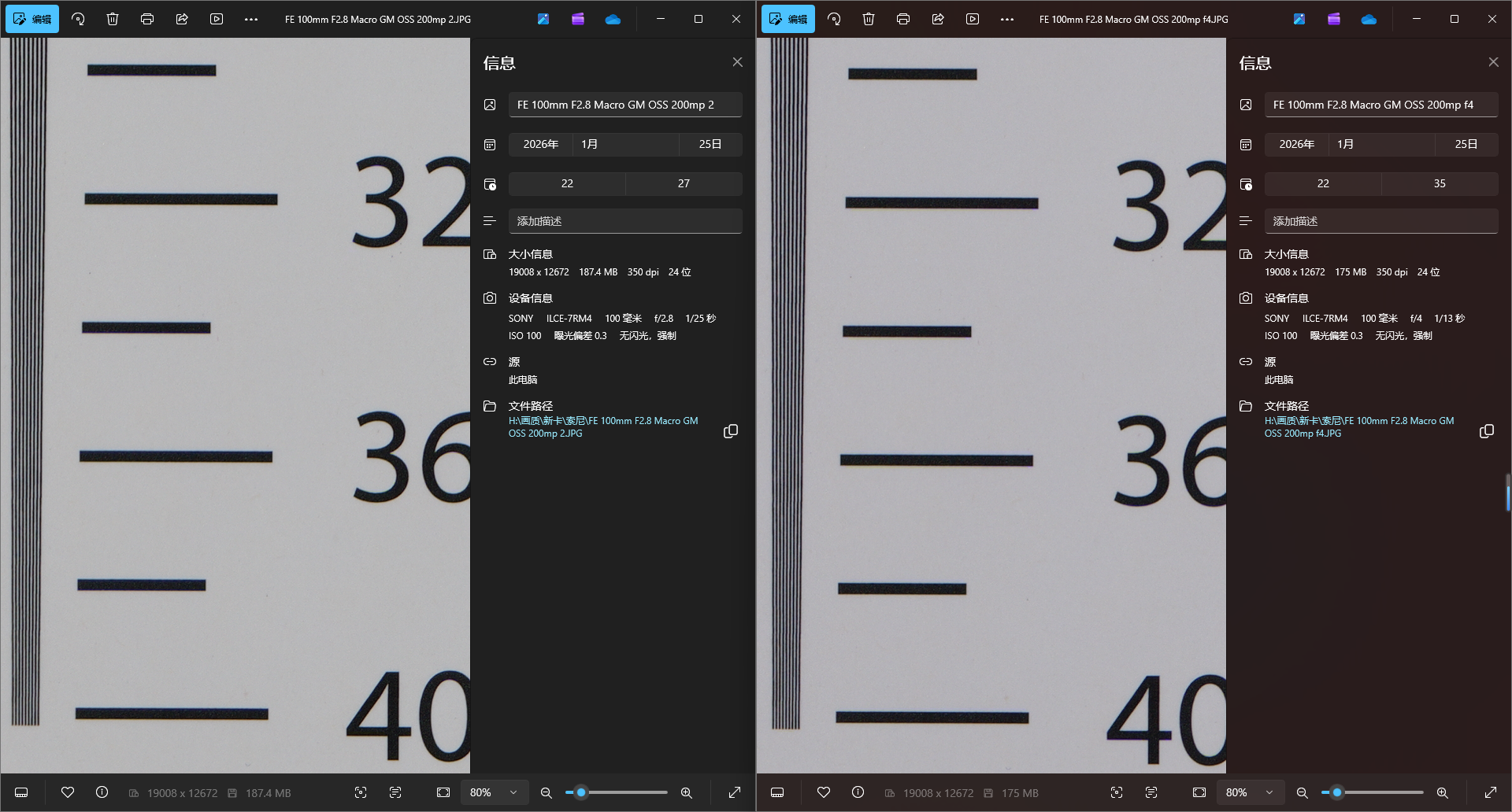 最后看一下F2.8和F4的中心差异,即使在两亿像素下肉眼也几乎无法分辨差异,所以在实际使用中无论全开还是需要收光圈都无需担心对画质的影响