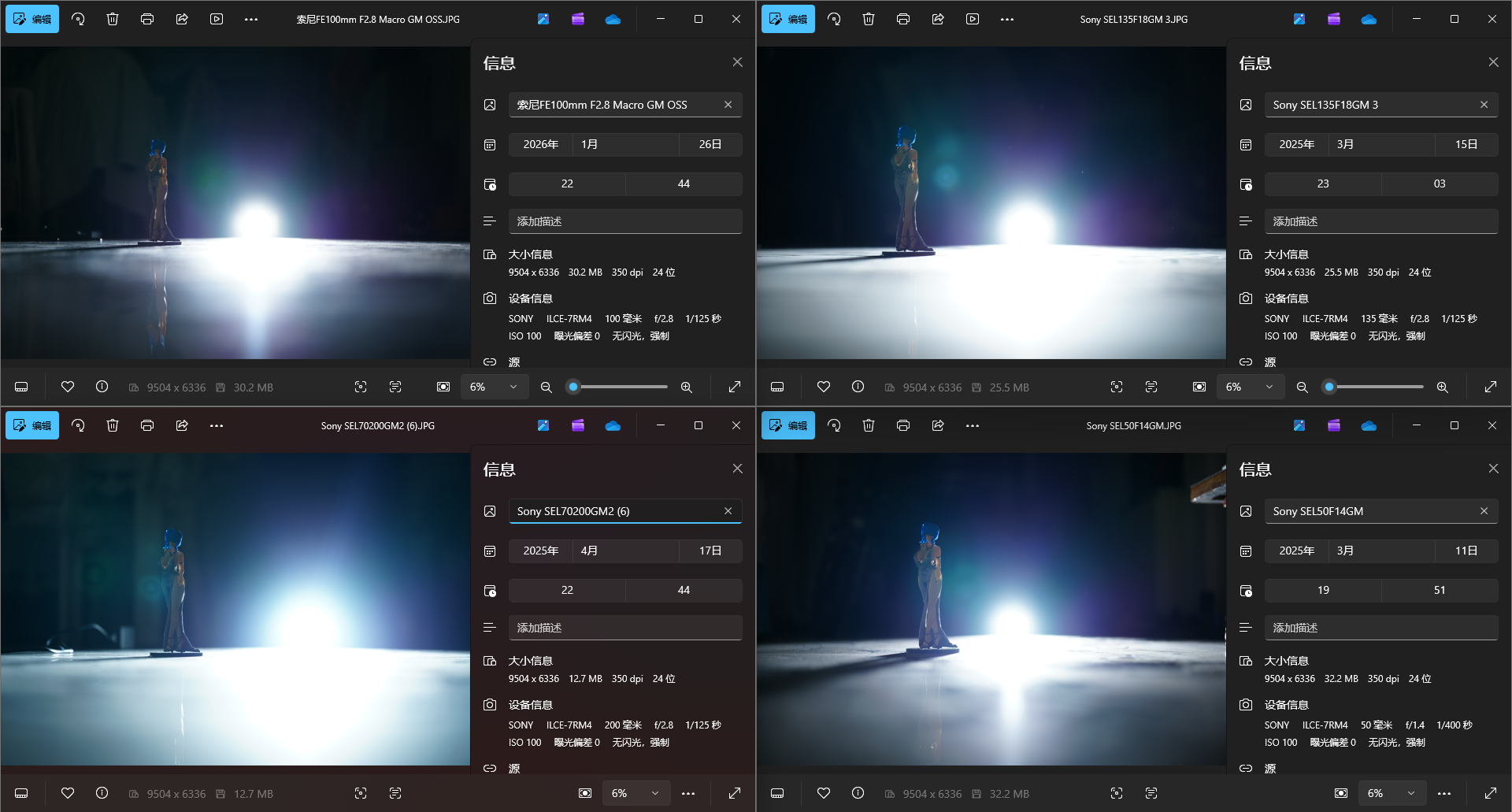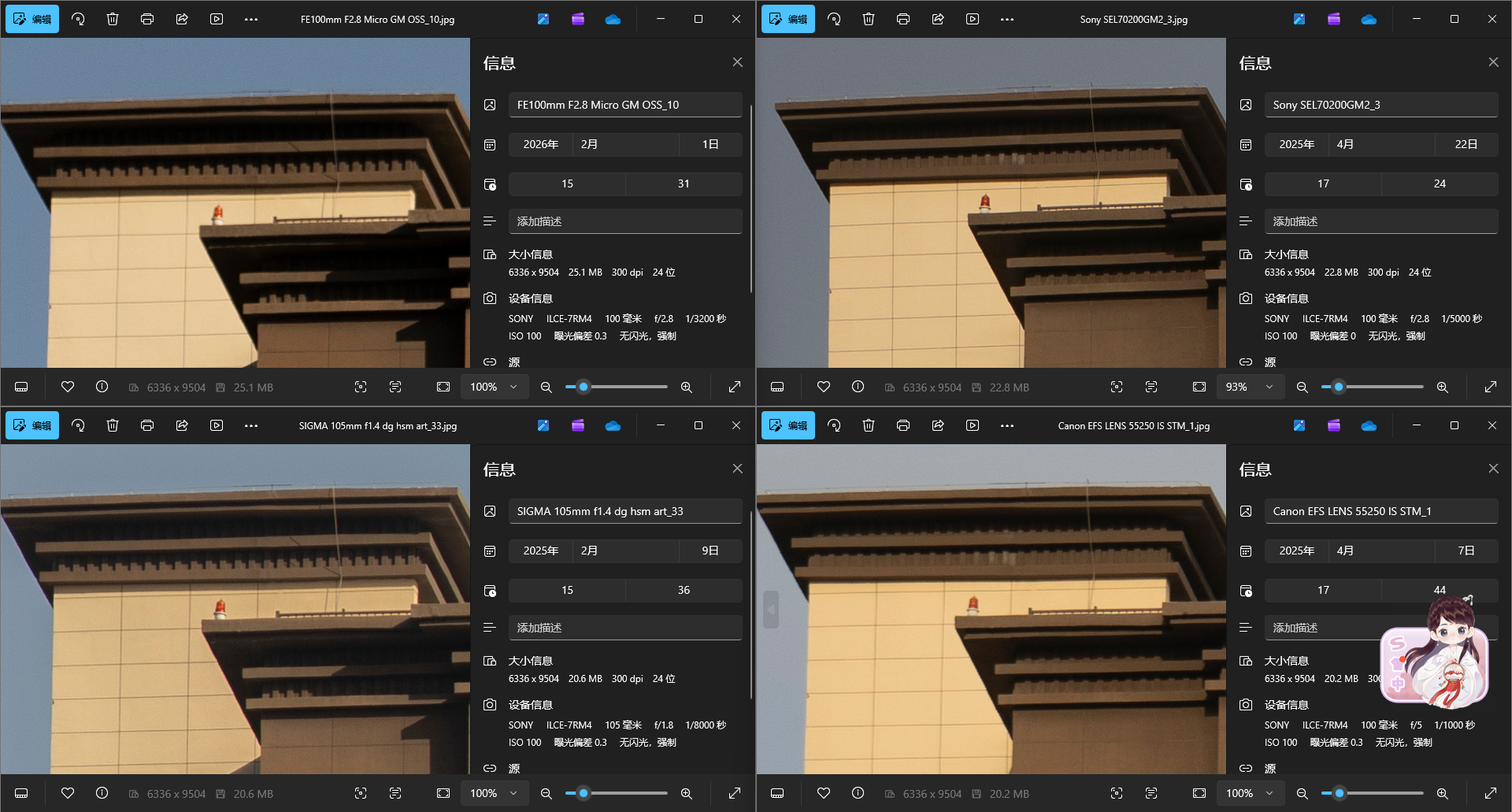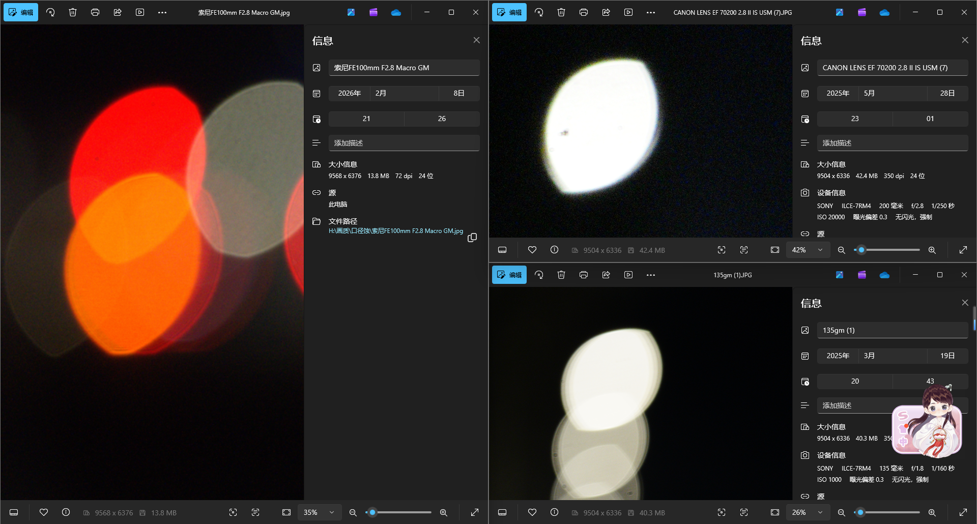 接下来选择一颗久负盛名的高画质G大师镜头135GM以及短摄距下表现极佳的50 1.4GM,可以看到在收到同光圈后色散方面依然都是100GM略微占优,当然了微距镜头设计光圈更小和近摄优化也有一定的优势
