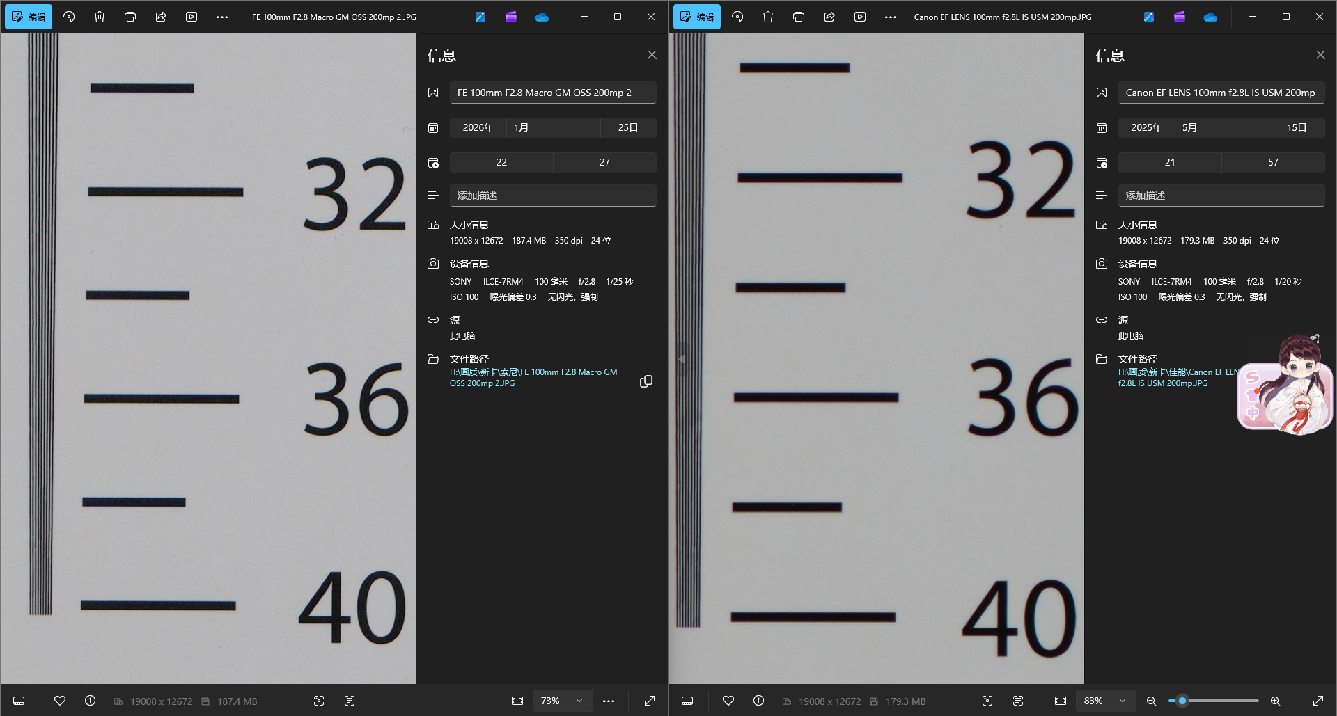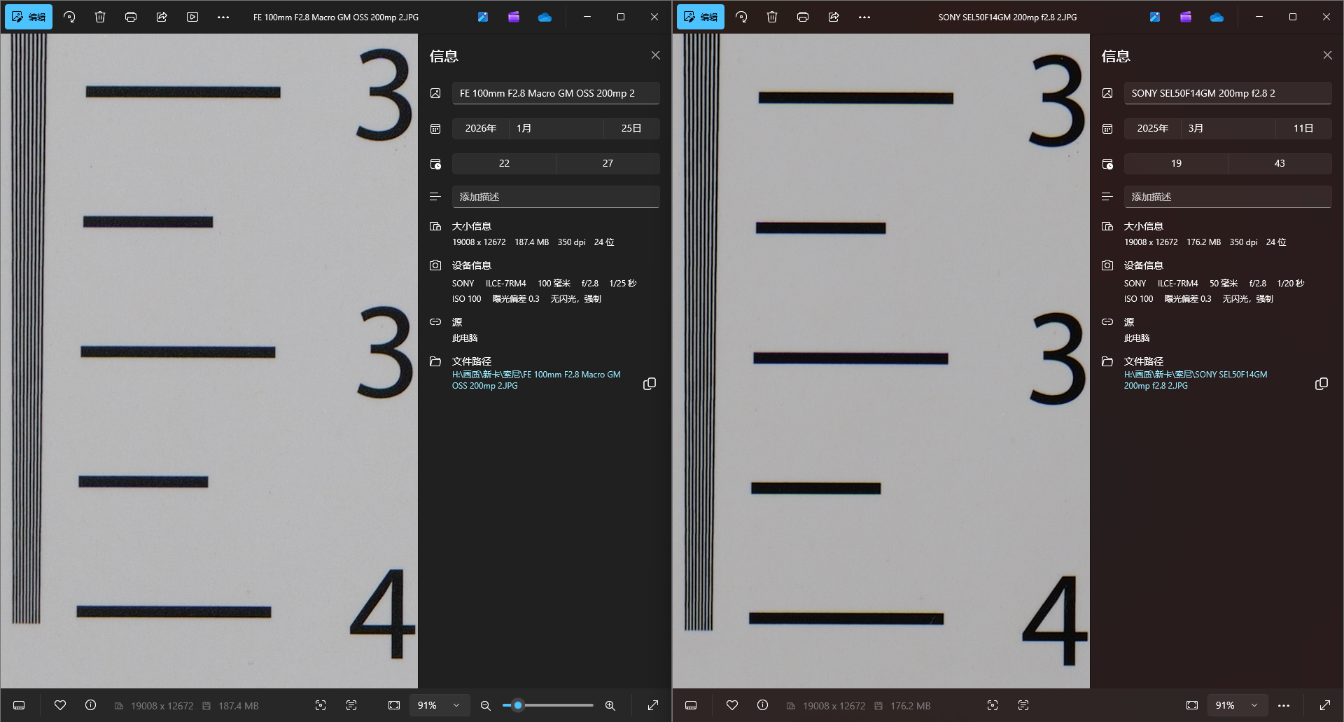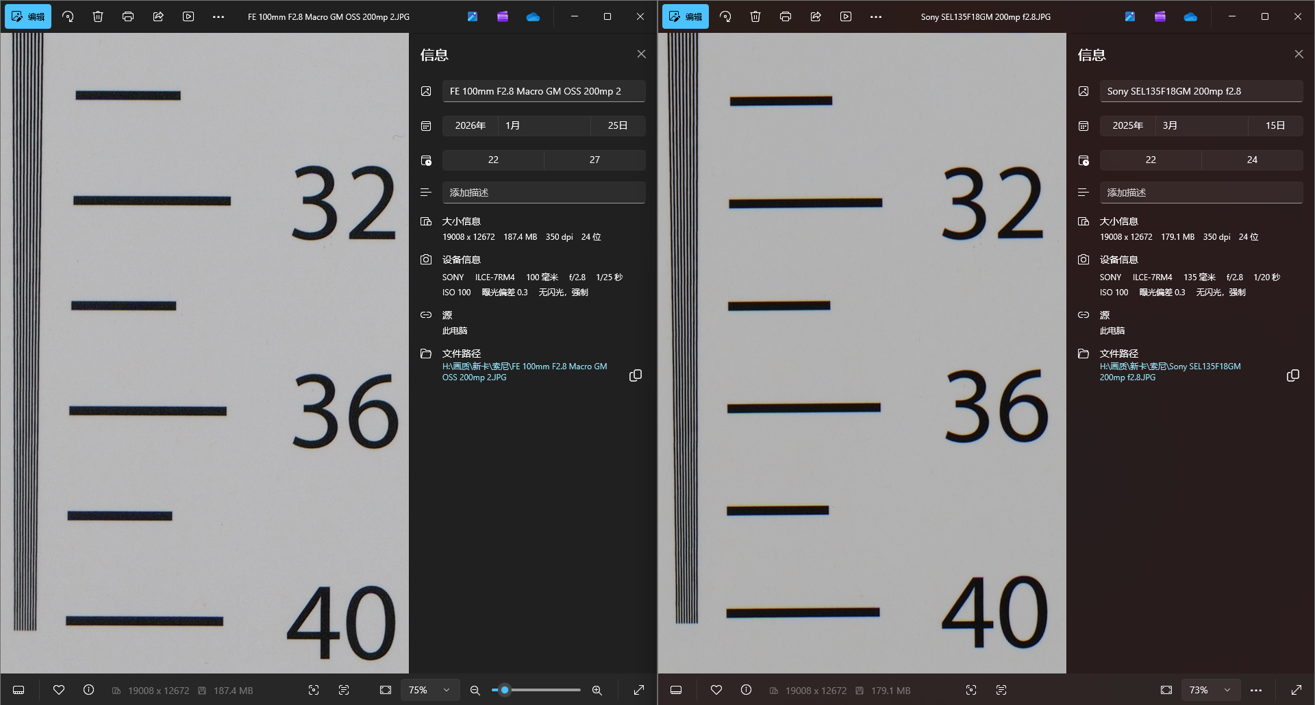 索尼这支FE100mm F2.8 Micro GM OSS采用了13组17片的镜片设计,其中有两片 ED低色散镜片,还有两片 XA 的超级非球面镜片。中心锐度不用多说,基本是开光圈就能打的状态。但让我更意外的是边缘表现,在微距和普通拍摄距离下,都非常稳定。拍产品、拍细节、甚至后期裁切空间,都给得很足。那近摄画质表现我们来看标板目前我的测试库里缺少同类产品可用来对比,我找了一些类似产品进行对比对比前代微距旗舰 EF100 F2.8L,可以看出后来者带来了巨大的画质飞跃。