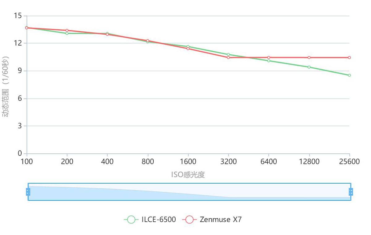 理论动态范围方面跟A6500基本一样,不过有个比较有趣的点就是大疆X7的Native ISO实际上只做到了3200,6400到25600全部都是电子增益。抛开这个不谈,大疆对于这款传感器的调校还是比较不错的。