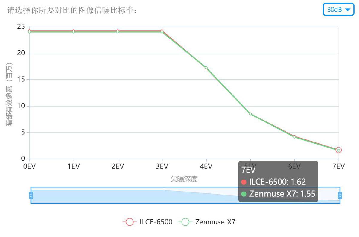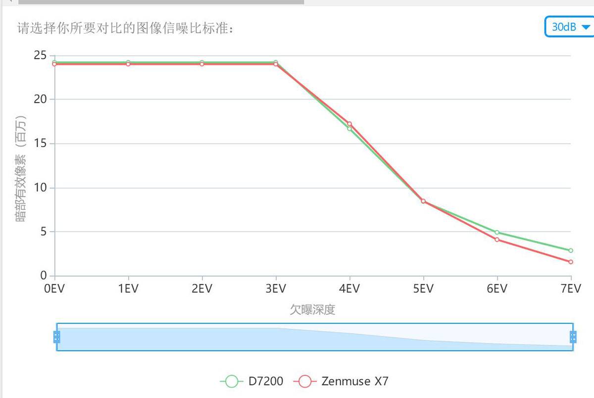 我们都知道单纯的动态范围只在画幅和量子效率相同的机身之间具有直接判定宽容度的价值,对于不同的传感器,实际曝光宽容度还需要进行测试。测试结果以“暗部有效像素”来表示,可以准确反映该相机能达到的实际宽容度。