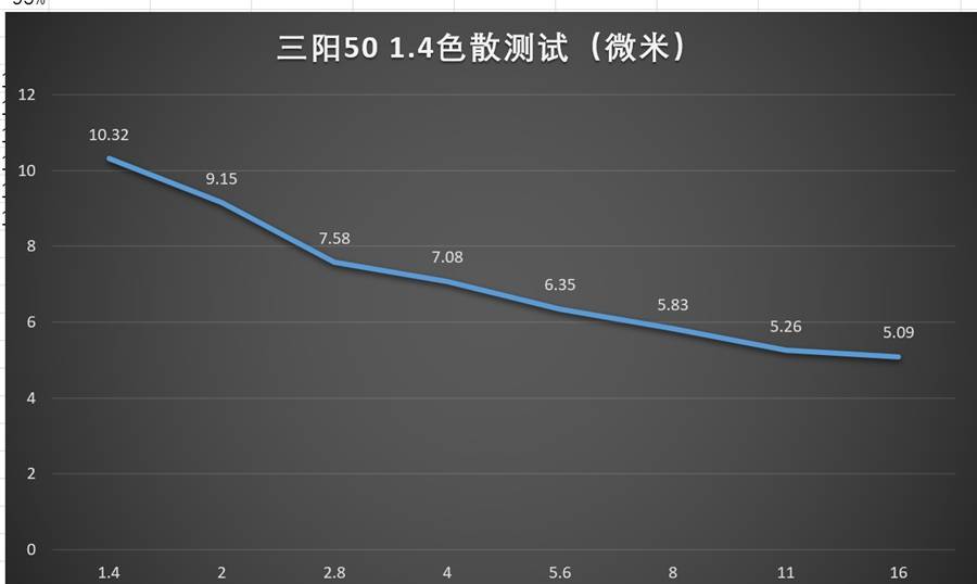 全开光圈下大概有10μm左右的色散,和我们之前f/1.8标头测试当中该项得分最差的尼康50 1.8G相当(略好一些)。