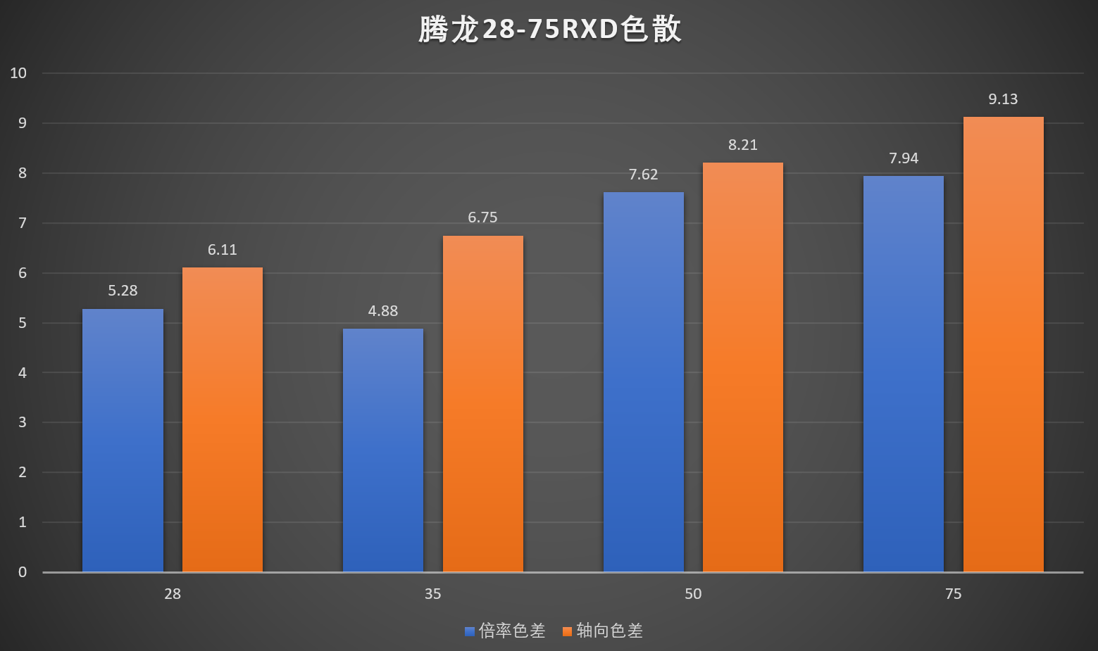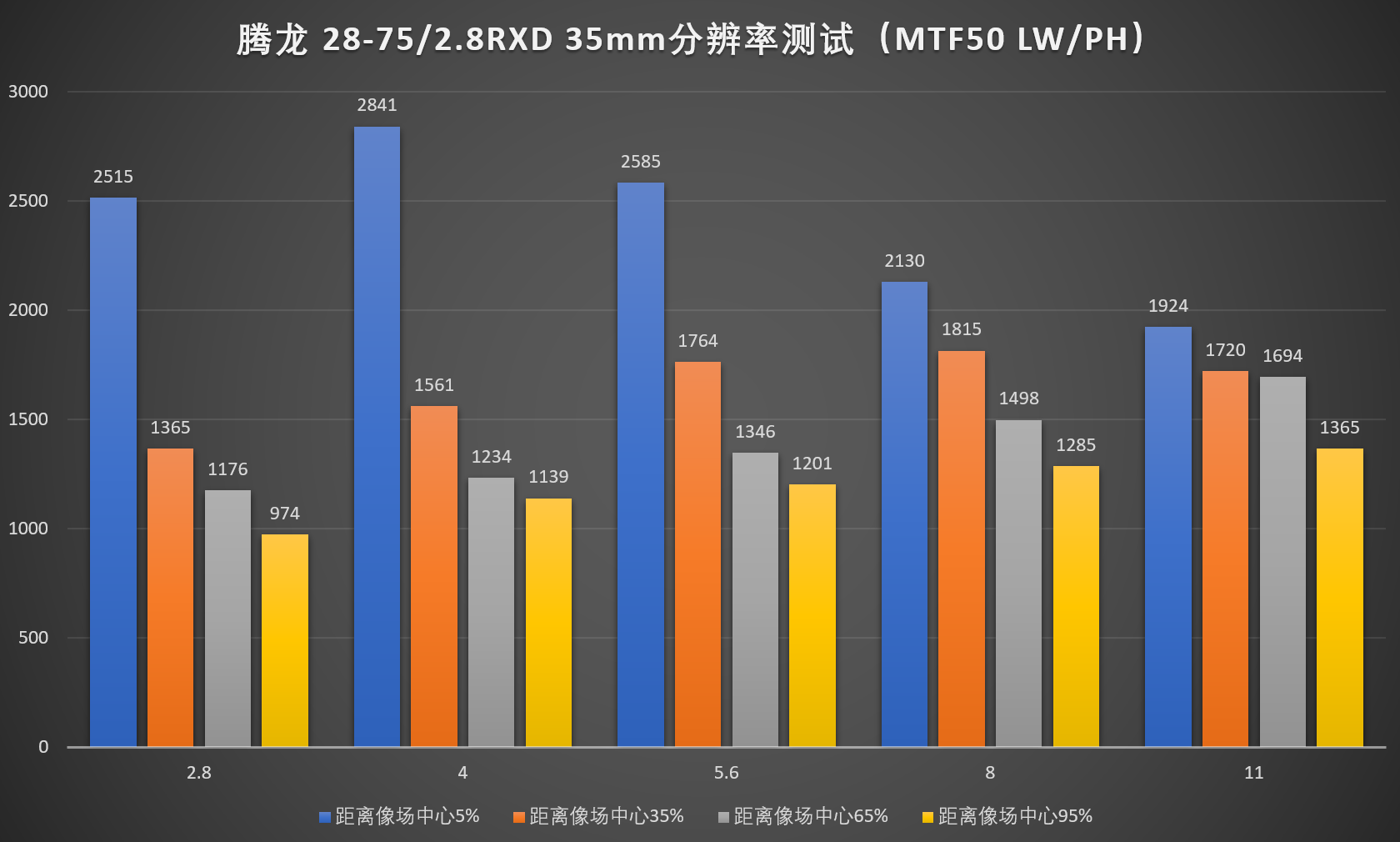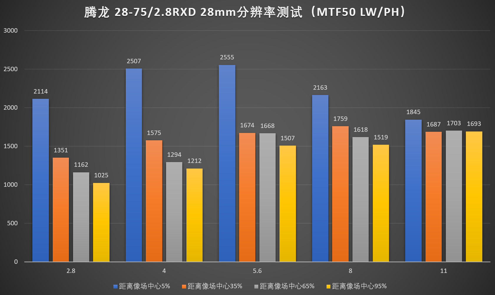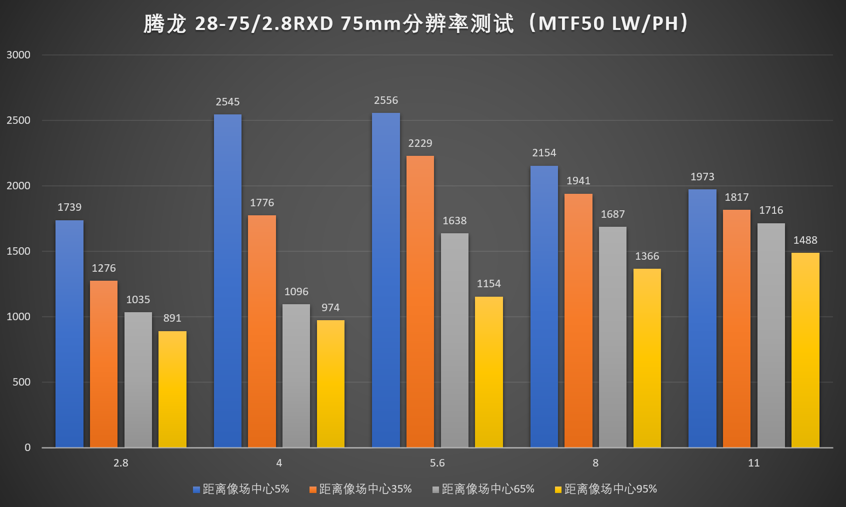 和其它24-70mm f/2.8 镜头表现一样,长焦端整体分辨率会有下降。但是腾龙 FE 28-75mm f/2.8 在50端全开光圈时的画质表现出色,无论中心还是边缘都不输给索尼 FE 24-70mm f/2.8 GM。但是在收缩光圈以后分辨率提升不大,被索尼 FE 24-70mm f/2.8 GM反超。