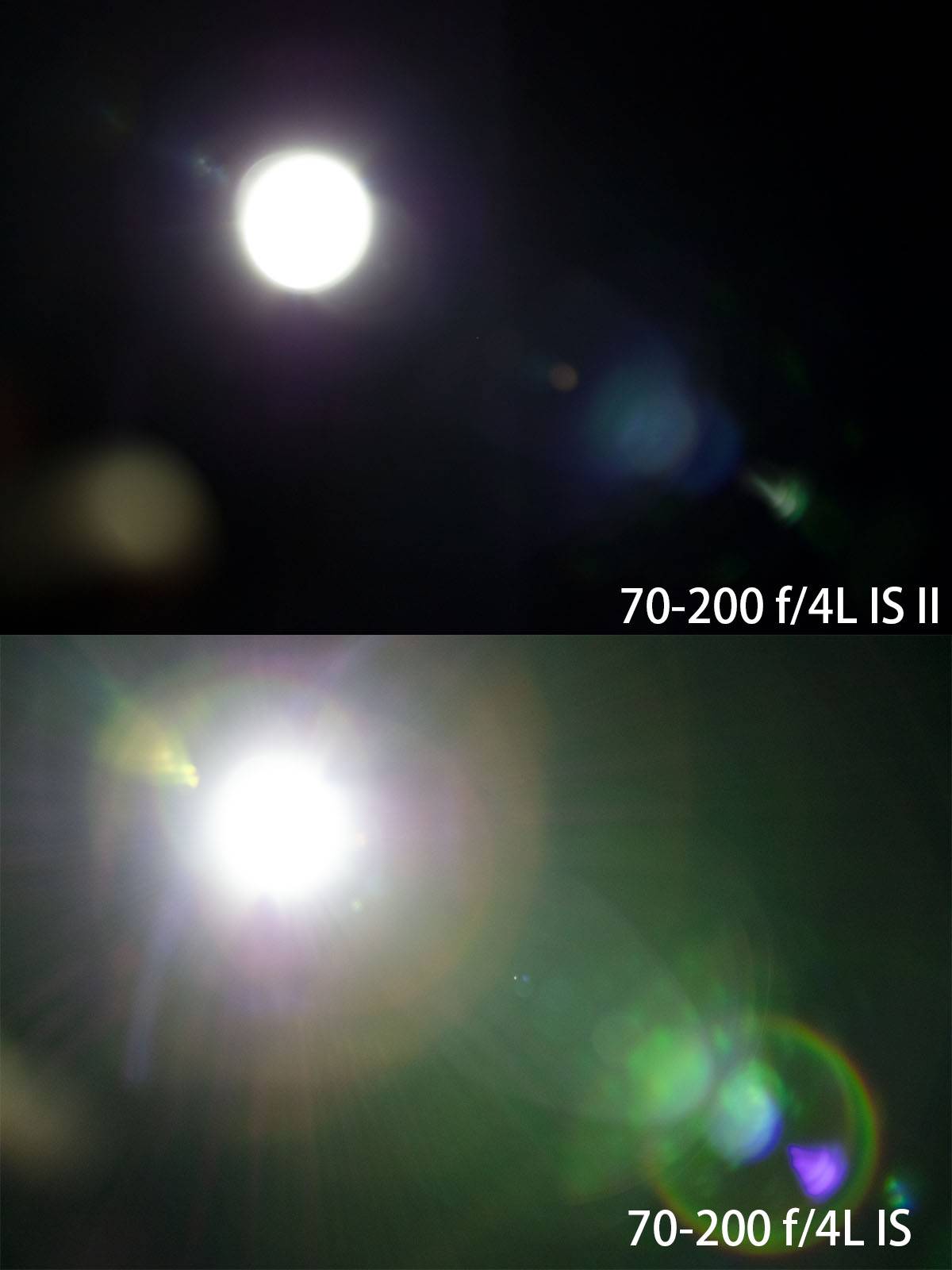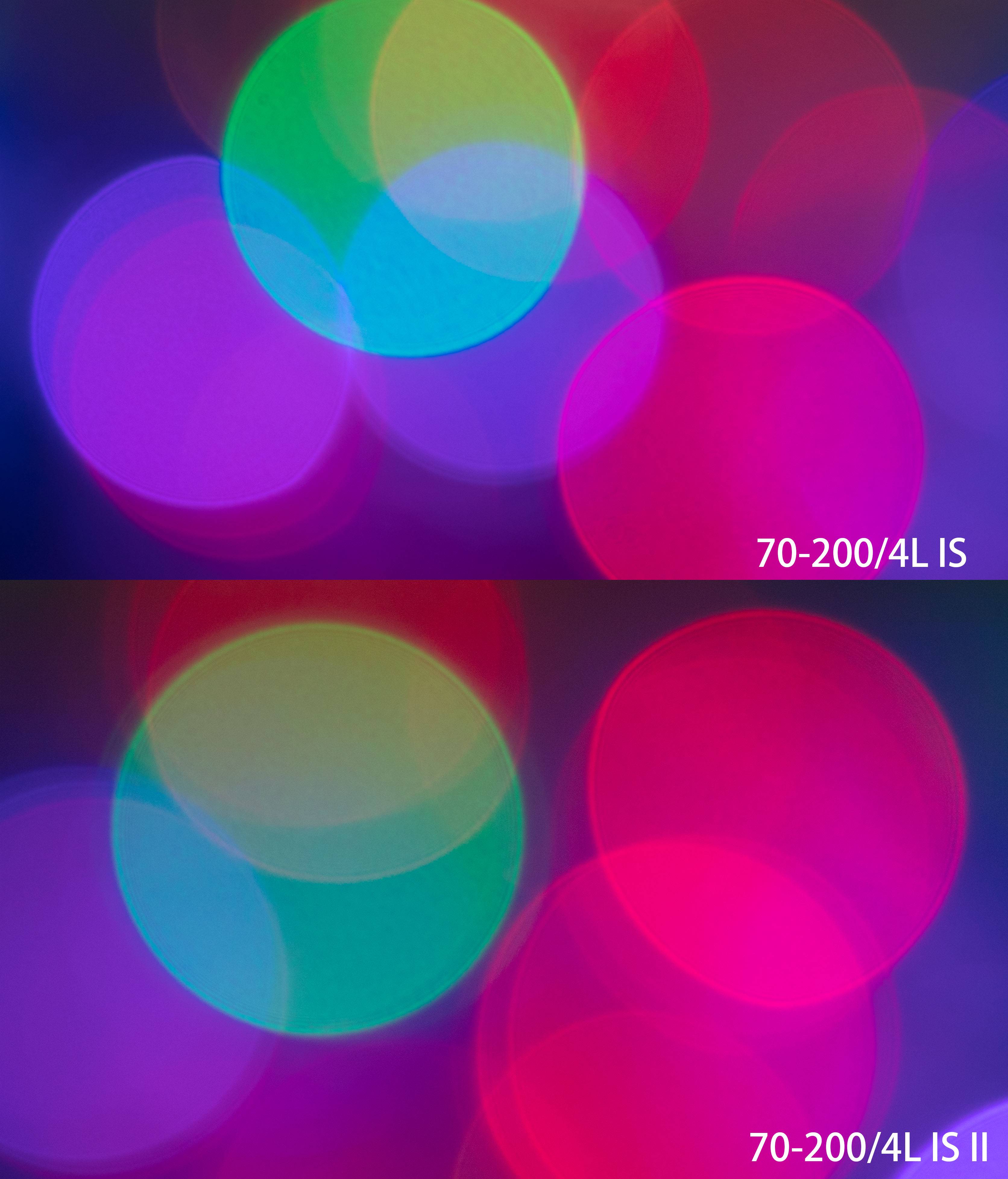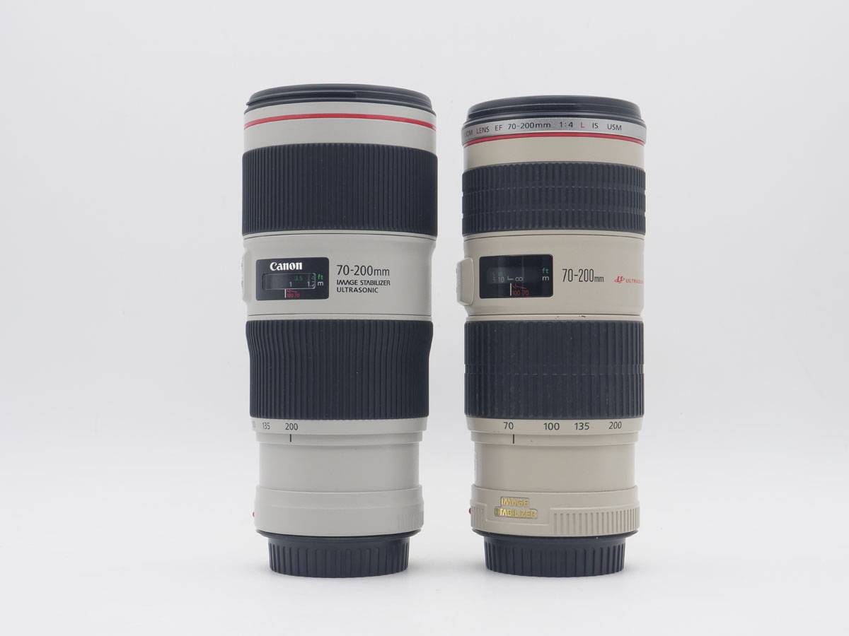整体外观方面IS小小白II(左)是纯白色,跟佳能从70-300L开始的新白炮配色保持一致。旧版产品则是老配色,有点发黄。除此之外胶皮、文字等方面也有不同。镜身尺寸也有所扩大,口径从老镜头的67mm扩大到了72mm——不过依然不能跟16-35/4IS和24-70/4IS共用滤镜(后两者都是77mm口径),有这个需求的可以试一下滤镜接环。
