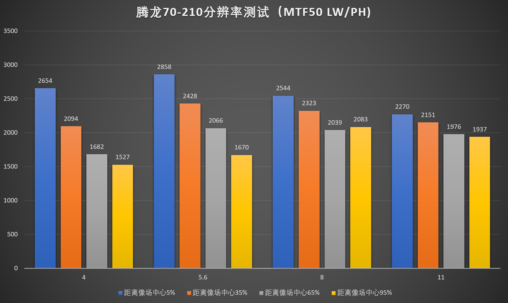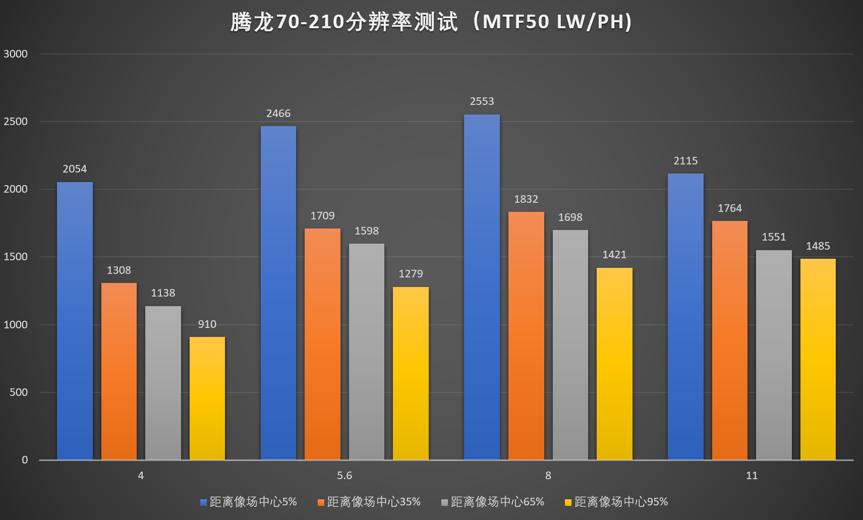 可能很多人会关心佳能IS小小白II和腾龙之前发布的70-210的的画质对比,这里把腾龙的数据也贴出来,可以看到单就70端分辨率来说两者基本是伯仲之间。