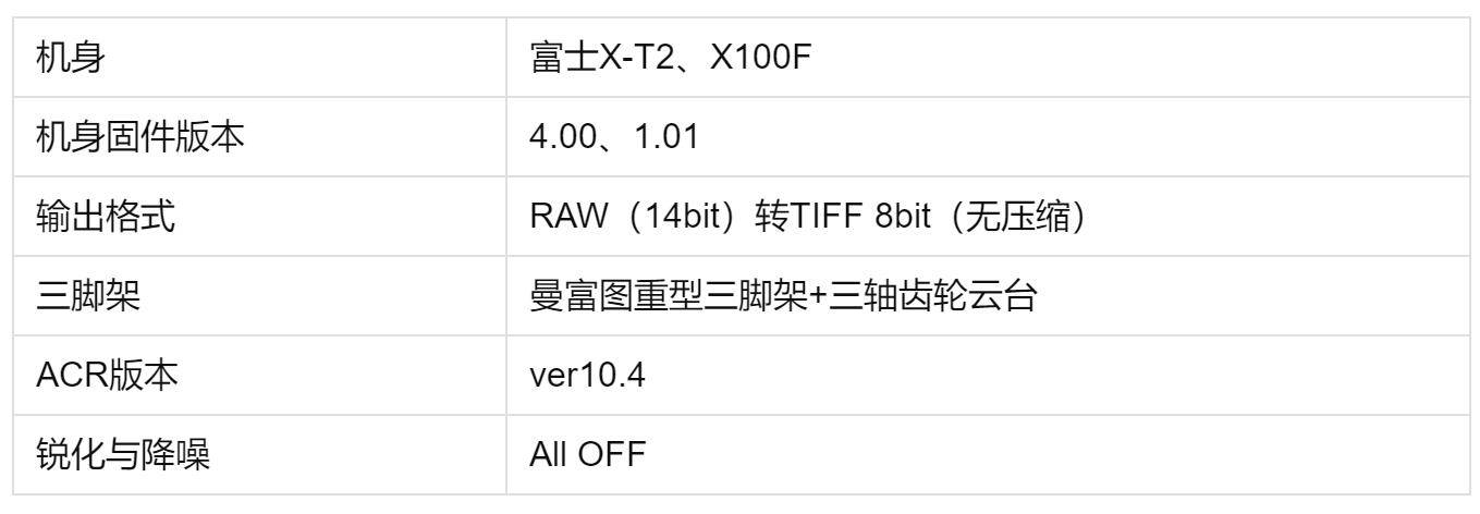 测试开始之前有一点需要说明一下,众所周知ACR对于富士X-Trans CMOS的RAW文件解码支持并不是很完美,但为了照顾整个测试流程的公正性依然采用了ACR来作解码,不过对于同一块乱排CMOS来说这个并没有会造成偏差的影响。考虑到此因素,请大家不要跨品牌比较数据,望周知。
