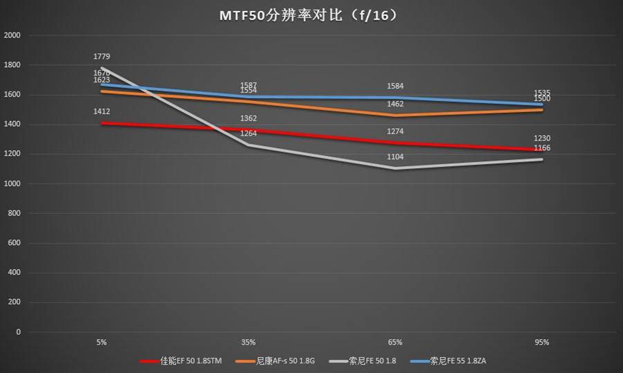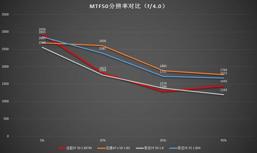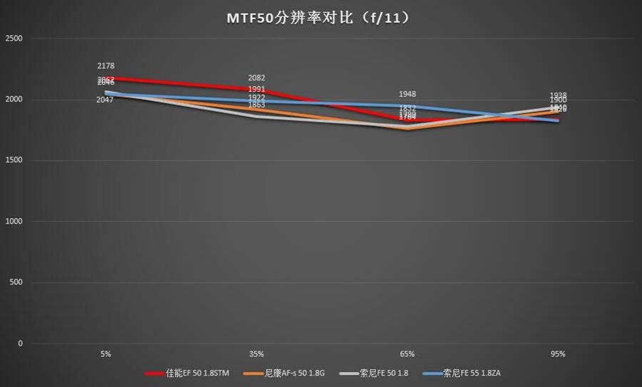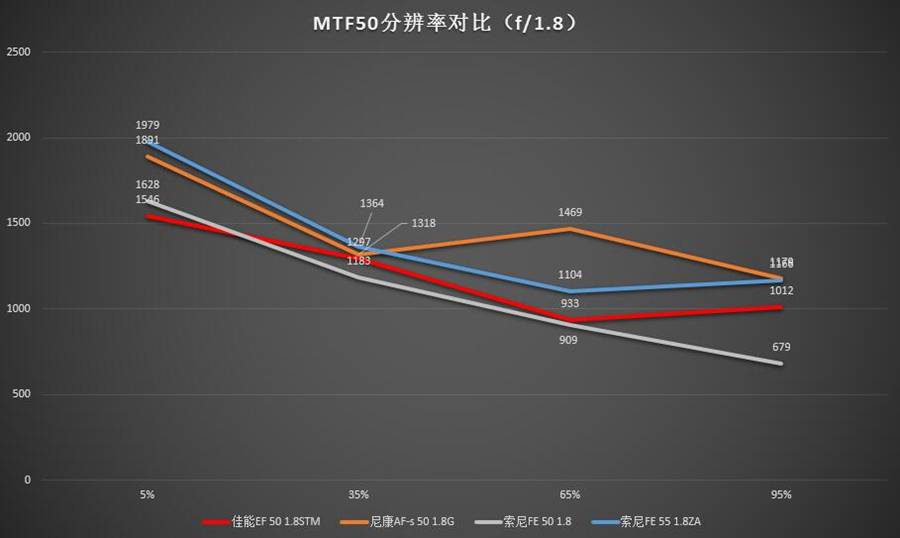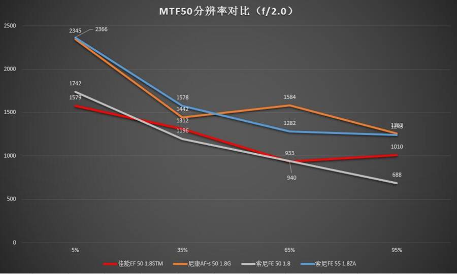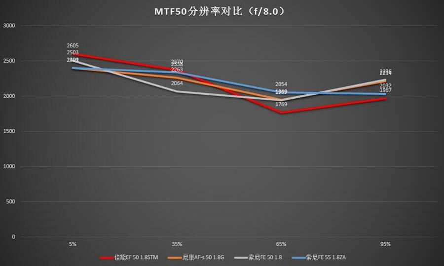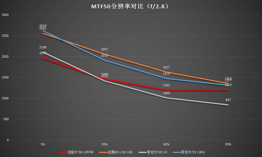 全开光圈是这类规格镜头使用的一种典型环境,在这种情况下中心分辨率最高的是索尼FE 55 1.8ZA(但是相比第二名尼康50 1.8G优势并不明显),往外走就开始跟尼康 50 1.8G互有胜负。距中心65%处尼康50 1.8G分辨率数值最高,最边角处二者相当。