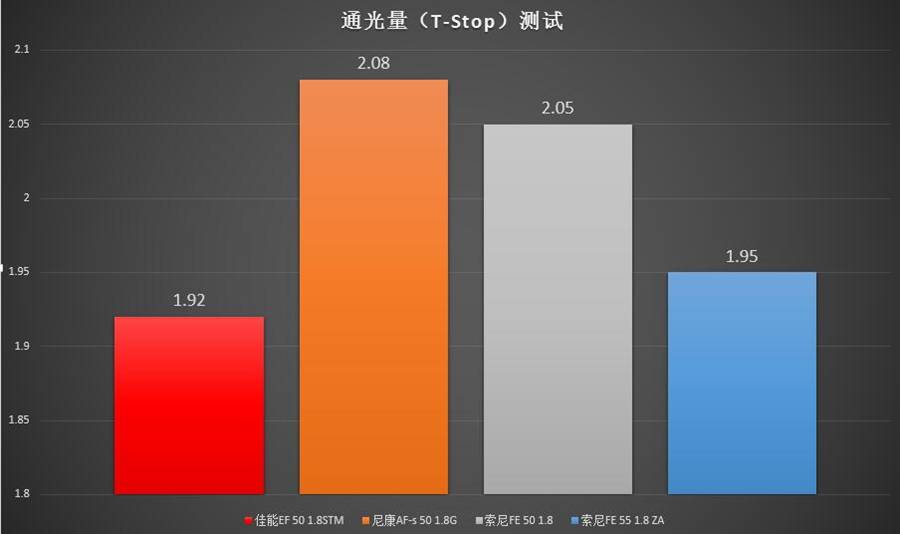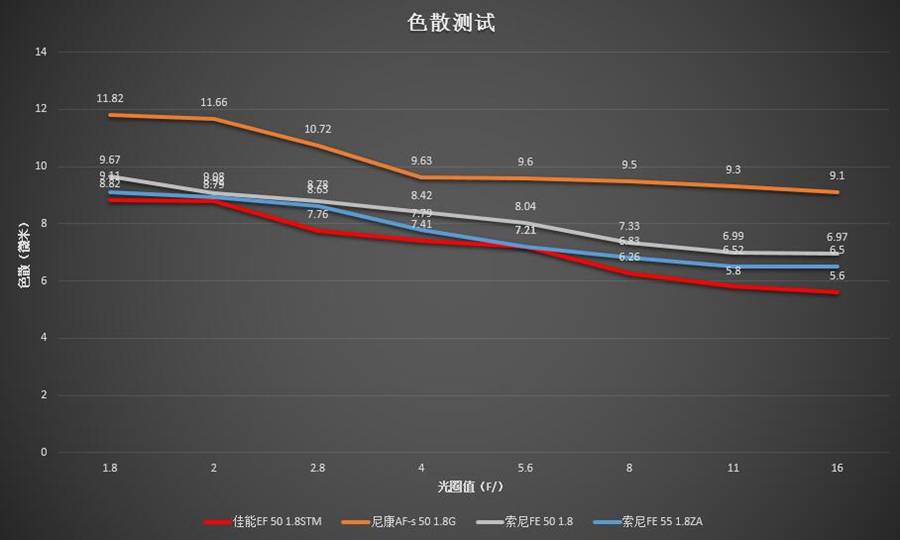 在分辨率测试环节表现拔群的尼康AF-s 50 1.8G镜头在这里表现不佳,色散控制处于垫底水平。色散控制最好的反而是最便宜的佳能50 1.8STM——虽然它和索尼的两支标头之间也没有太大的差距,可以认为三者处于同一水平。