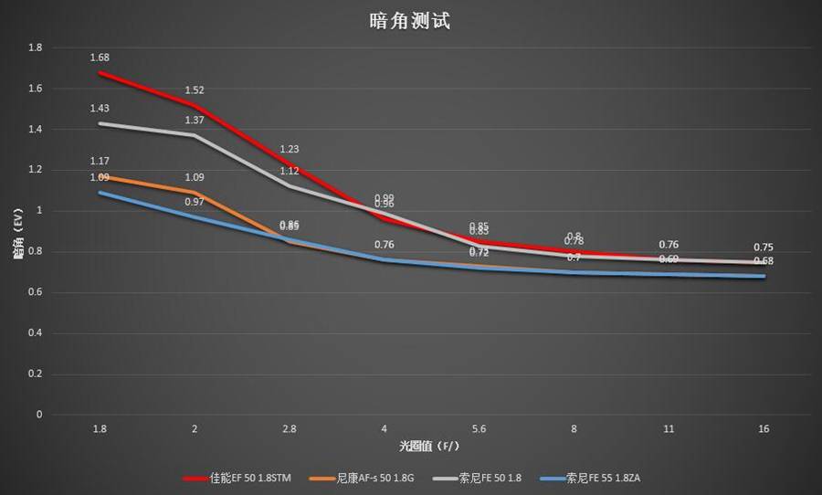 虽然暗角在数码时代也可以很轻松的通过后期修正来解决,然而后期提亮暗角需要强吃传感器的宽容度,也一定会影响最终图像的信噪比——所以还是需要看一看的。佳能50 1.8STM的暗角情况最为严重,再加上佳能机身低ISO下的宽容度落后于索尼和尼康机身(非要提D5那茬那当我没说),可能会对边角画质产生一定的影响。不过考虑到这几款镜头经常被搭配在APS-C机身上使用,此时镜头暗角的影响相对来说不是那么明显。