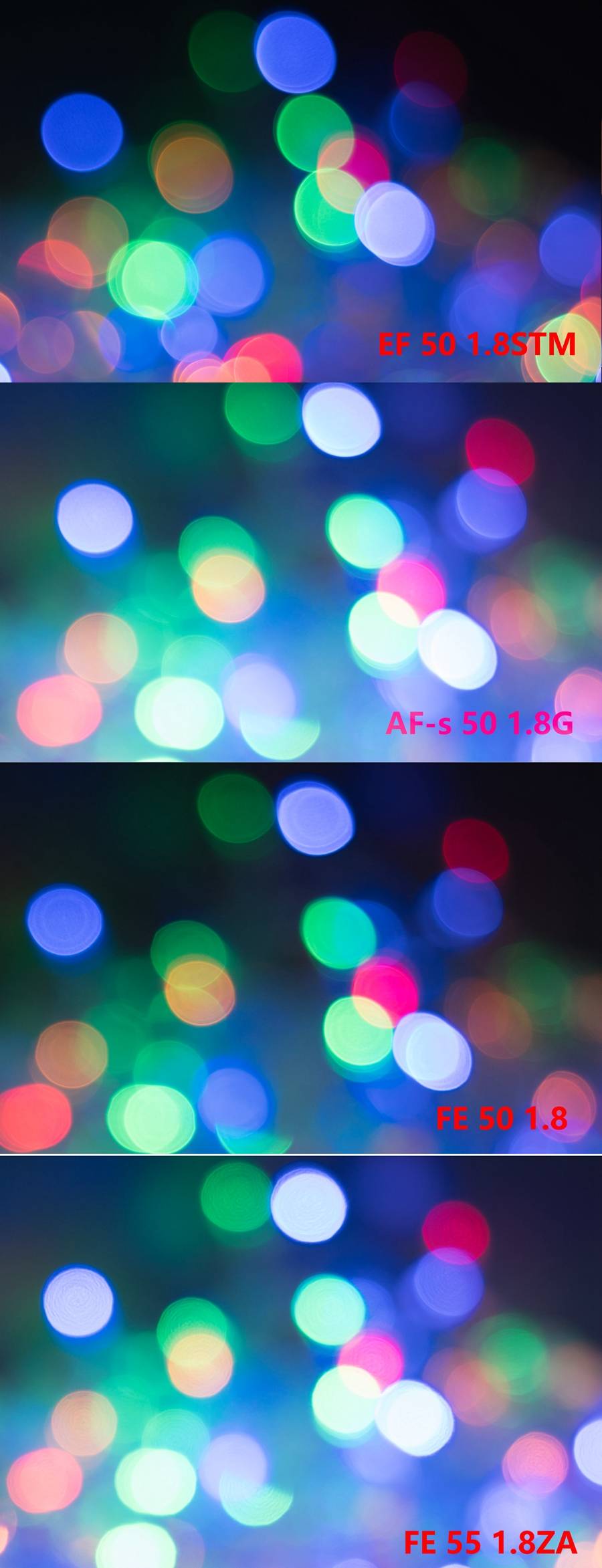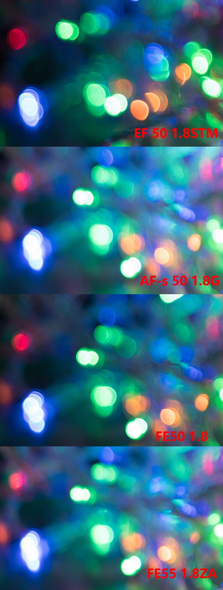 从光斑的圆度上看,表现最好的也是索尼FE 55 1.8,其次是佳能50 1.8STM。