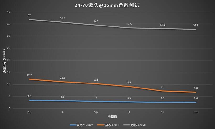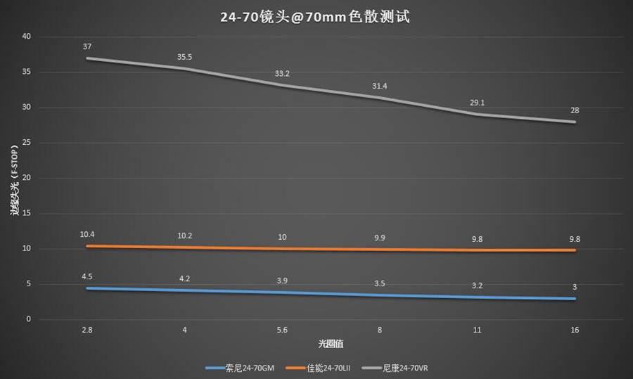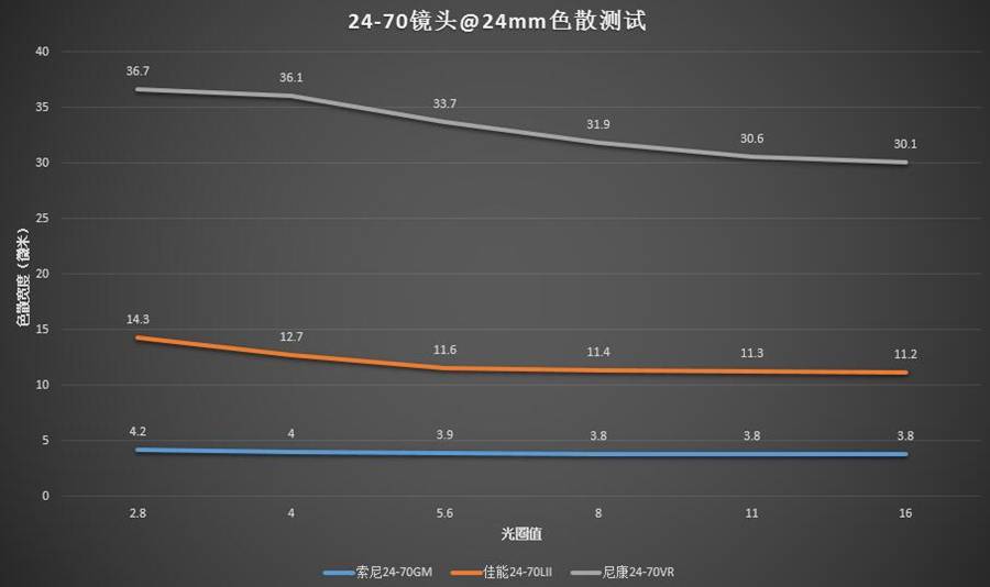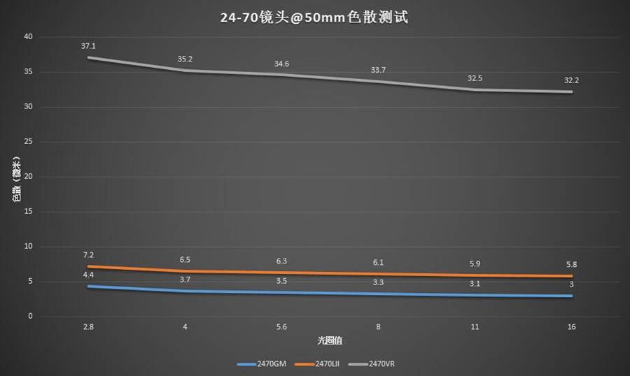 ▲ 整体趋势依然没有变,佳能 24-70mm f/2.8 L II的色散相比广角端有所减轻,索尼 FE 24-70mm f/2.8 GM依然有着绝佳的色散控制(但是相对于佳能 24-70mm f/2.8 L II的领先程度有所缩减)。尼康 24-70mm f/2.8 VR还是那么的一骑绝尘……