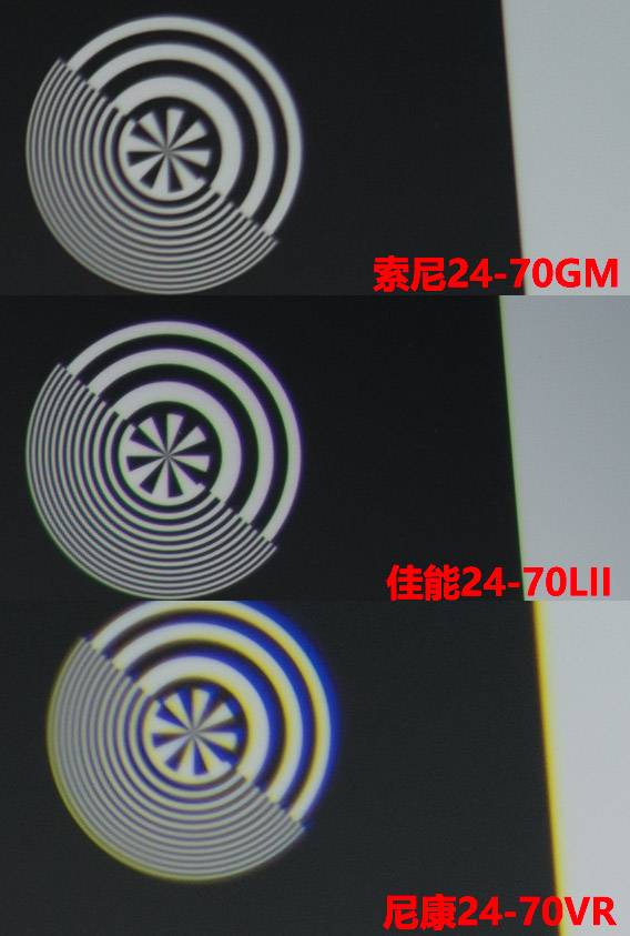 是的,请相信你的眼睛,你没看错,尼康 24-70mm f/2.8 VR和索尼 FE 24-70mm f/2.8 GM的色散就是有大约9倍的差距。这也是继老架构佳能机身的动态范围之后我们再一次看到同级同代产品的单项成绩一个甩离另一个八九倍这种盛况的出现(3EV的动态差距就是8倍,别忘了对数标度)。其实都不用读数,直接看标板的原图都能发现索尼 FE 24-70mm f/2.8 GM惊人的色散控制力和尼康 24-70mm f/2.8 VR大花边之间的逆天差异:(下图均为24mm f/2.8,截取画面边缘)