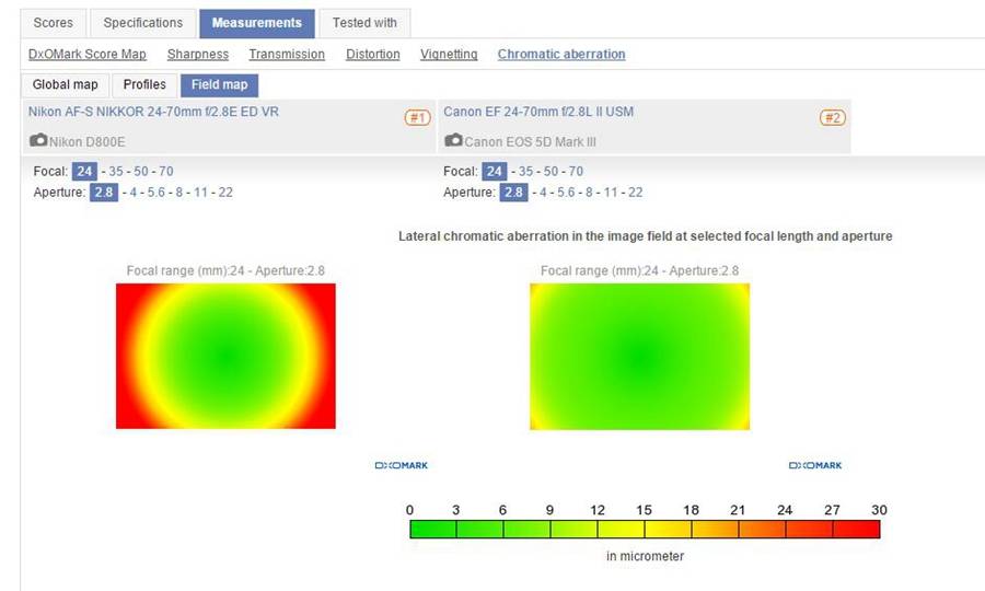 针对24-70变焦镜头的特点,理论画质测试部分分为24、35、50、70mm焦距四个小节,分别提供完整的测试数据比较。