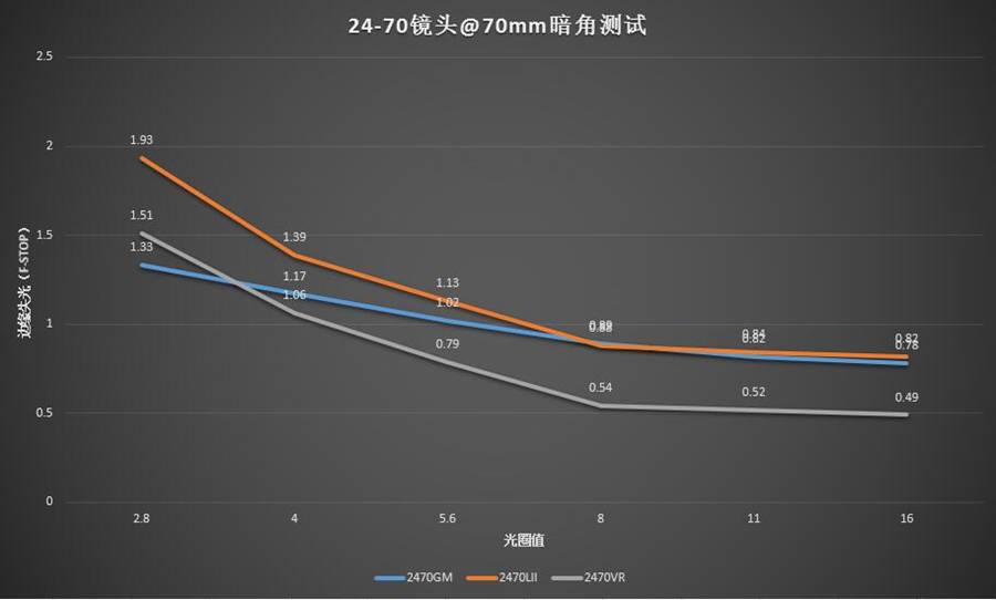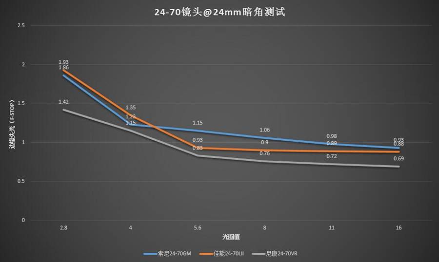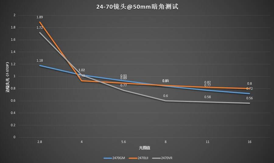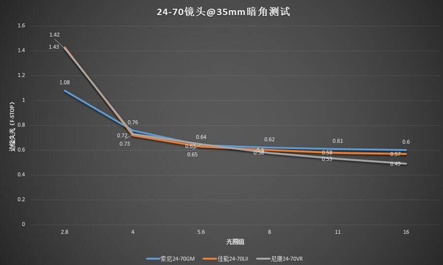 ▲ 全开光圈暗角控制最好的依然是索尼 FE 24-70mm f/2.8 GM,但是略收光圈之后尼康 24-70mm f/2.8 VR就开始领先。佳能 24-70mm f/2.8 L II最差,相对于索尼 FE 24-70mm f/2.8 GM来说多了0.5EV的边缘失光。