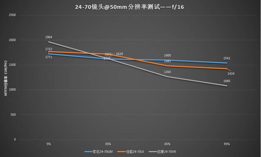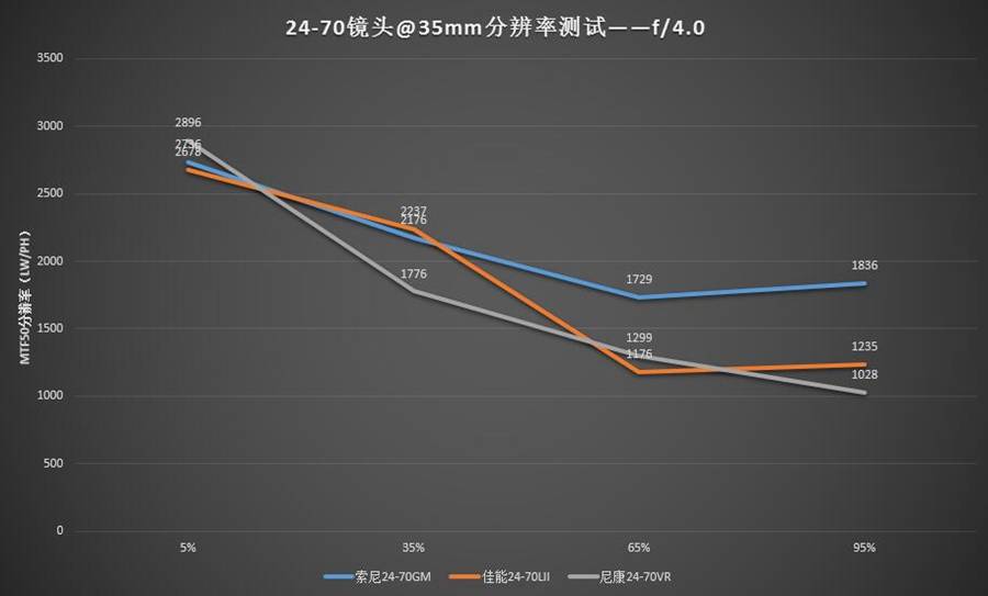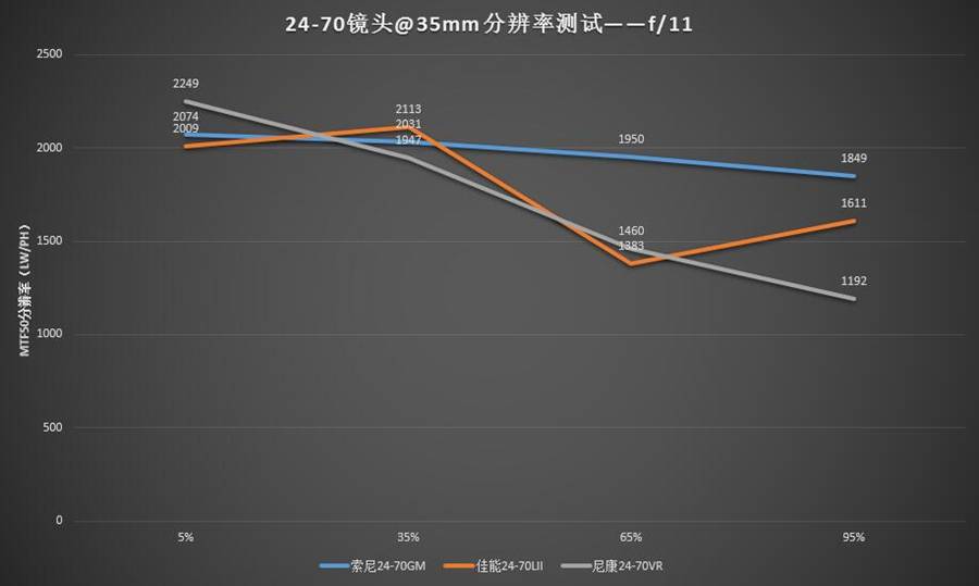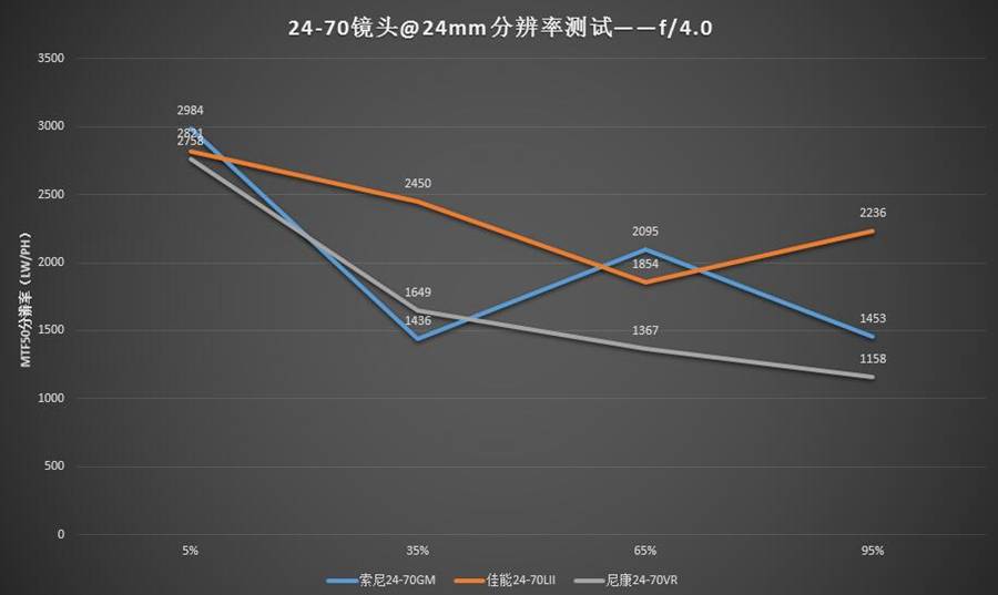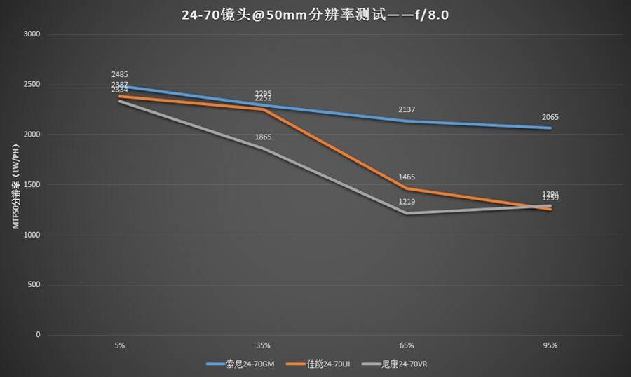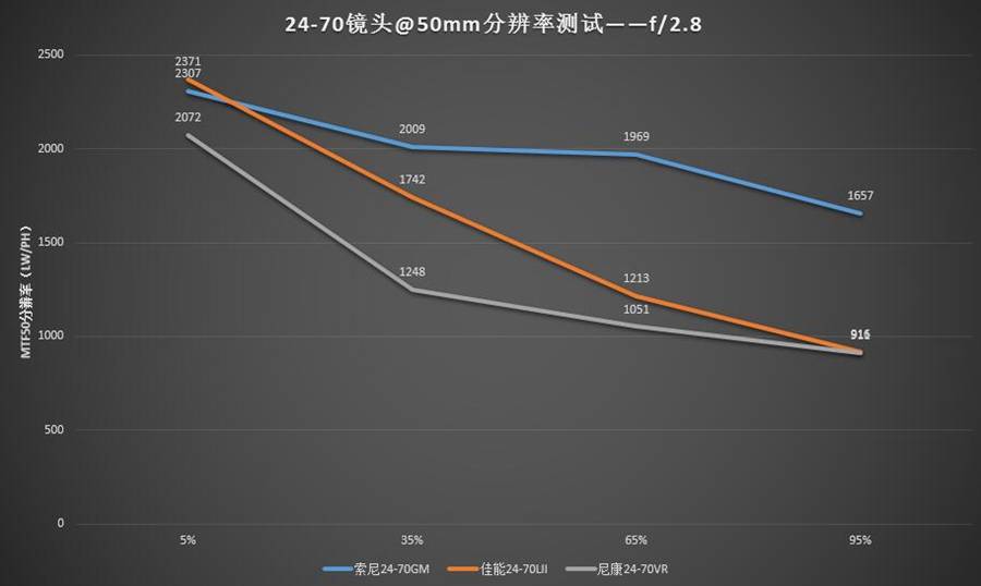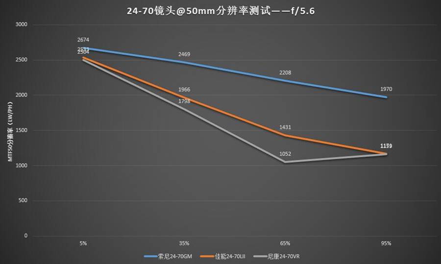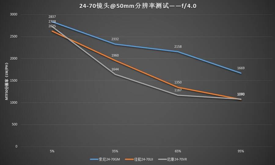 ▲ 50mm端光圈全开分辨率索尼 FE 24-70mm f/2.8 GM除了画面中心略低于佳能 24-70mm f/2.8 L II外,其余均大幅领先。
