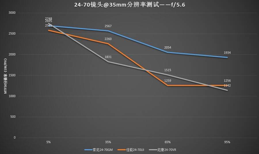 ▲ f/5.6光圈下索尼 FE 24-70mm f/2.8 GM的优势开始显现,佳能和尼康的表现相当。