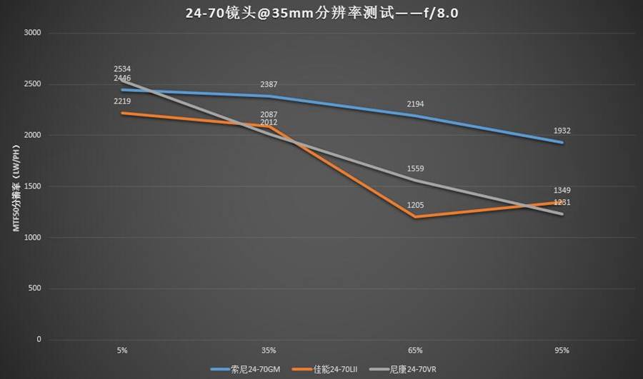 ▲ f/8.0光圈下索尼 FE 24-70mm f/2.8 GM除了最中心之外已经全面领先。佳能和尼康各有所长。