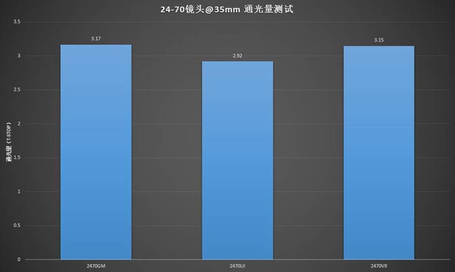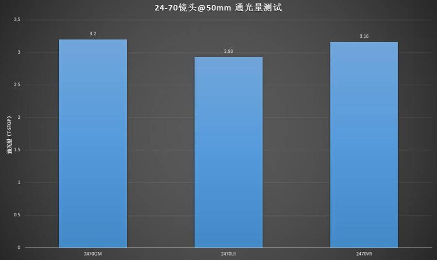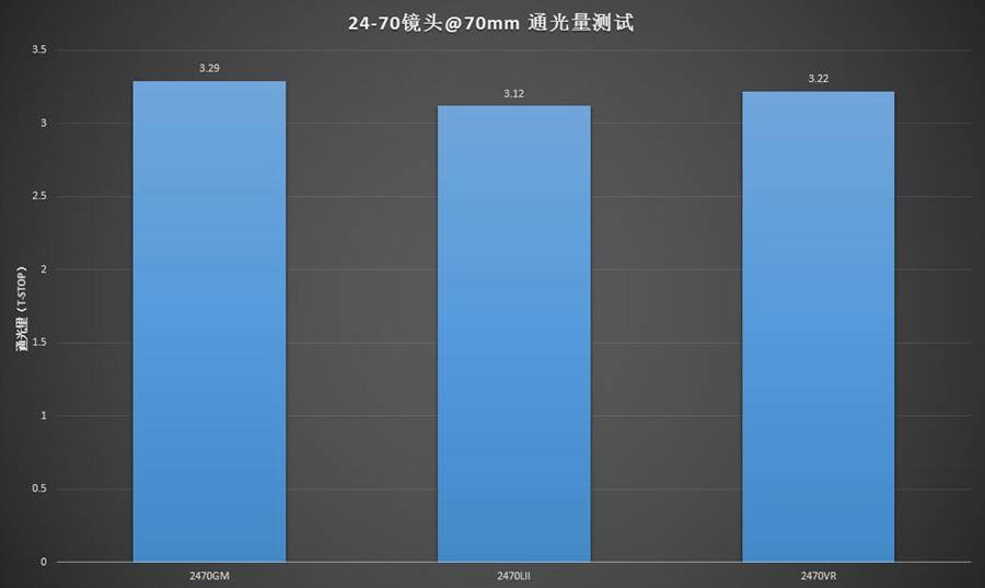▲ 三支镜头的通光量相对于各自的广角焦段都有所降低,但是横向之间的对比仍然延续了之前焦段的趋势。