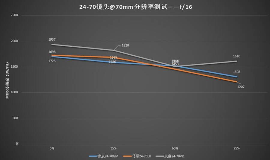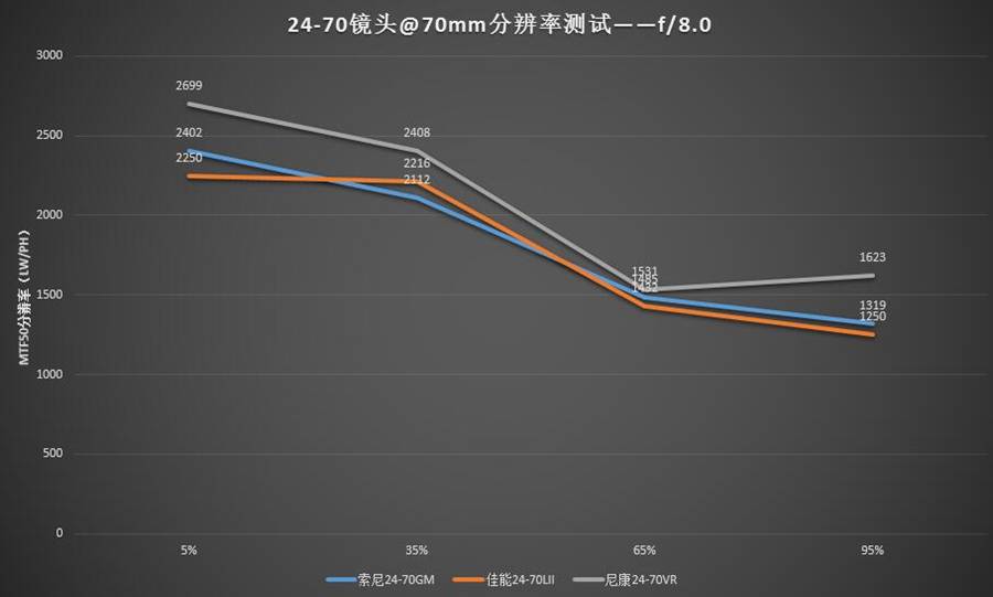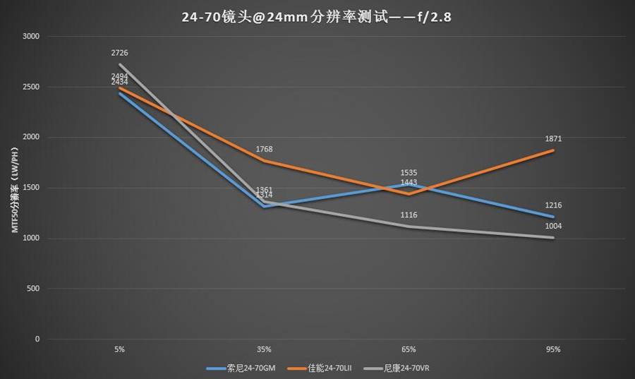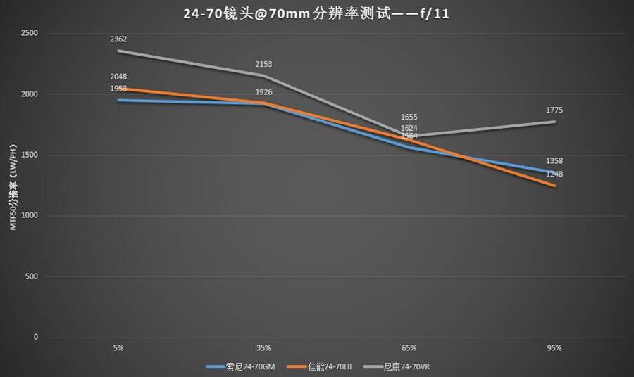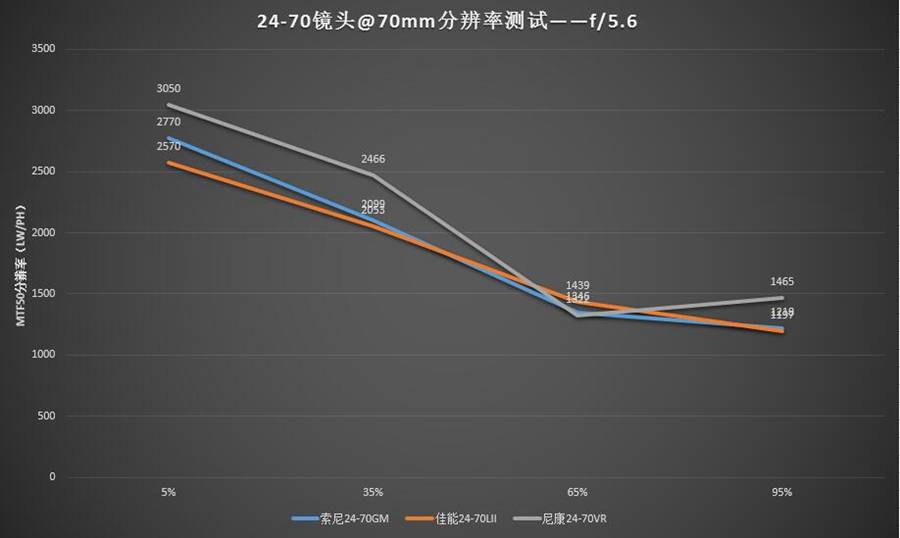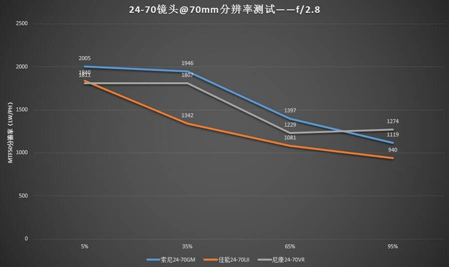 ▲ 70mm端光圈全开分辨率索尼 FE 24-70mm f/2.8 GM 的表现最佳,其次是尼康 24-70mm f/2.8 VR。佳能 24-70mm f/2.8 L II在这个焦段全开光圈时表现欠佳。