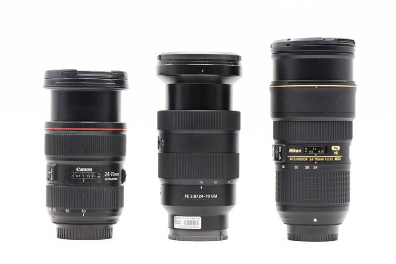 体积方面,虽然三支镜头的口径同为82mm,粗细基本相当,但是佳能 24-70mm f/2.8 L II 在高度上最短,比起其它两只镜头有明显的体积优势。重量上,佳能 24-70mm f/2.8 L II也是最轻的(805g),其次是索尼FE 24-70mm f/2.8 GM(886g)和尼康 24-70mm f/2.8 VR(1070g)。