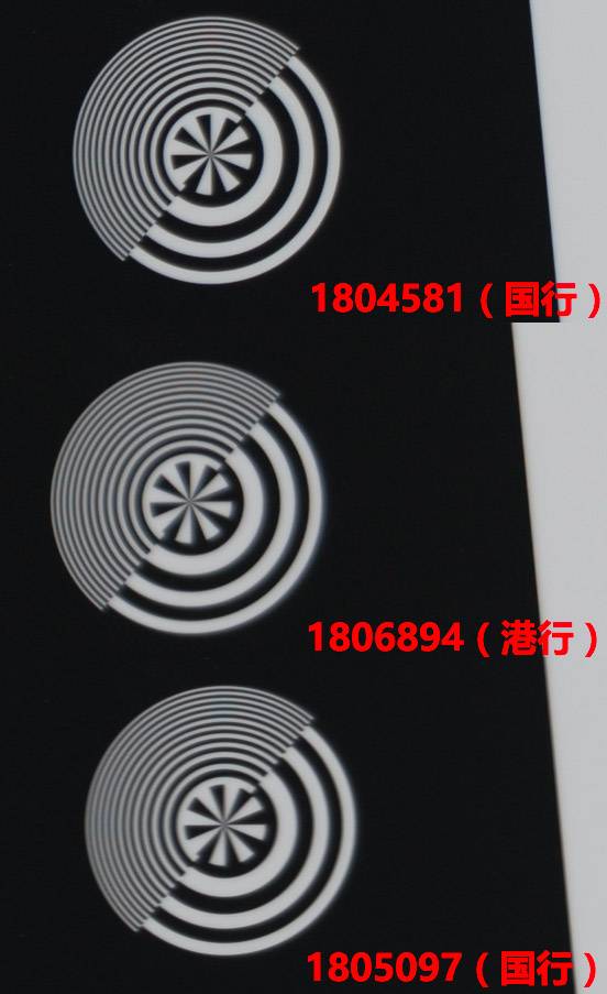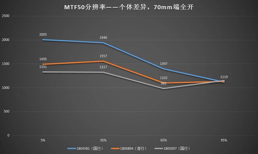 我们对三只索尼 FE 24-70mm f/2.8GM 在实验室拍摄标版读数,可以看到三只镜头的分辨率有明显差异,已经显著超出正常的个体差异范围。
