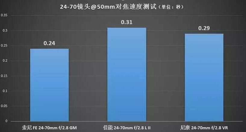 搭配A7R2机身的索尼 FE 24-70mm f/2.8 GM镜头具有最快的速度,再次说明现在顶尖无反系统在单次自动对焦速度上已经完全不是问题,已经具备了和单反系统一较高下甚至领先超越的水准。搭配D810的尼康 24-70mm f/2.8 VR和搭配5D3的佳能 24-70mm f/2.8 L II对焦速度基本处于同一水平线。