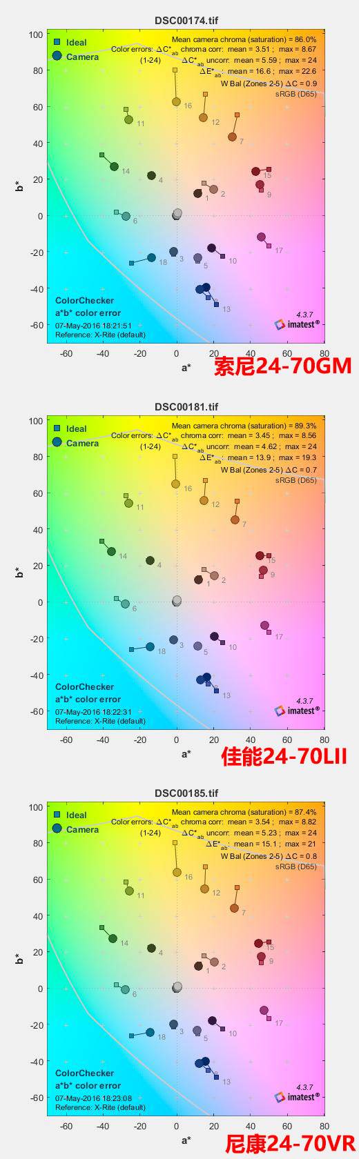 三者在成像色彩上没有本征差异,佳能 24-70mm f/2.8 L II的色彩相对来说饱和度高一点,而且9号、15号色块(类肤色)偏粉,对于人像的表现而言应当更有好处。其他色彩的表现几乎没有差异。