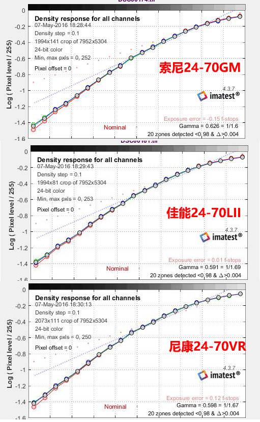 三者当中反差最高的是索尼 FE 24-70mm f/2.8 GM(Gamma=0.626),其次是尼康 24-70mm f/2.8 VR(Gamma=0.598),佳能 24-70mm f/2.8 L II(Gamma=0.591)仍然延续了佳能低反差的风格。