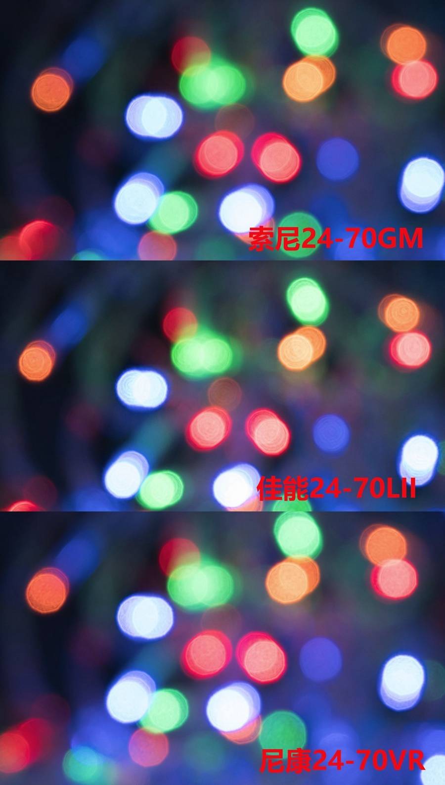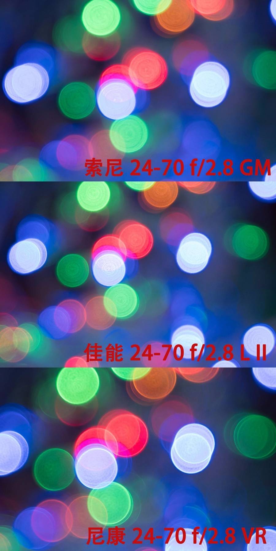 索尼 FE 24-70mm f/2.8 GM 尽管采用了一片高精度研磨非球面镜片,但是另外两片普通非球镜片仍然拖累它的表现,在“洋葱圈”控制上,并没有表现出高精度XA的优势。在亮边上,索尼 FE 24-70mm f/2.8 GM 确实控制的最好,观察焦外光斑,它的亮边是最不明显的。