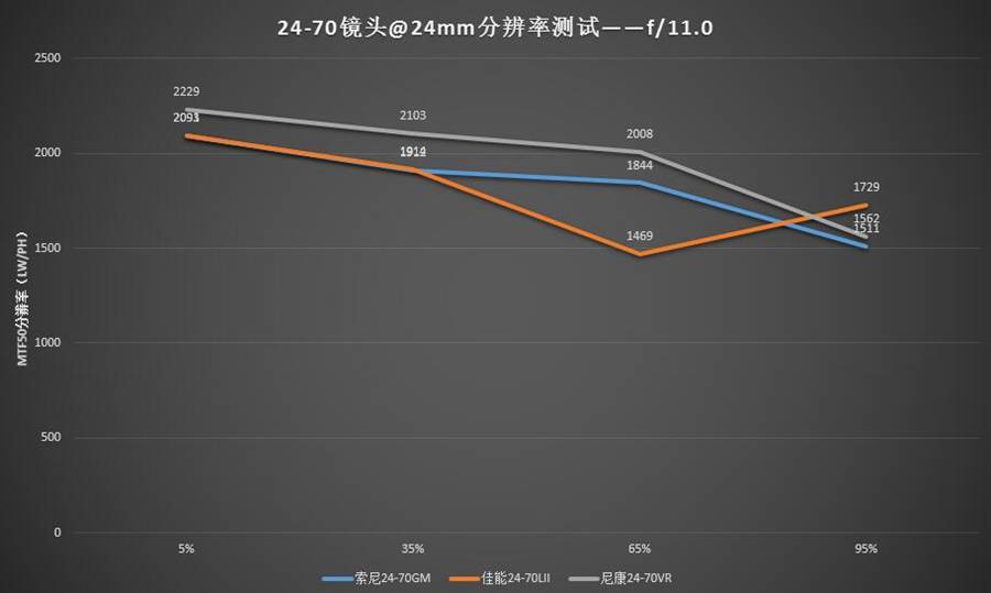 ▲ f/11光圈,佳能 24-70mm f/2.8 L II开始反超索尼 FE 24-70mm f/2.8 GM。索尼 FE 24-70mm f/2.8 GM作为今年的新头,最佳光圈倾向于最大光圈的趋势非常明显,一定程度上牺牲了小光圈素质。
