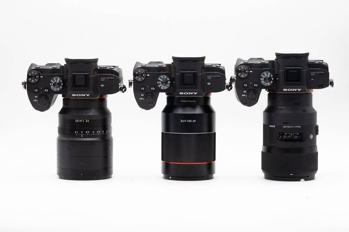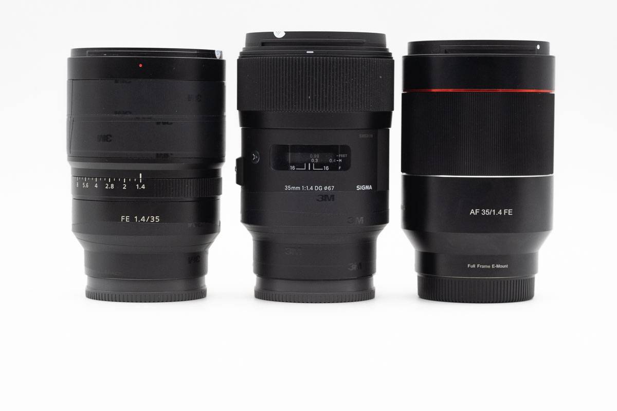 适马FE 35mm f/1.4 ART是基于单反镜头的结构垫平了法兰距的产物,另外两支都是原生的短法兰距设计。但是受益于适马这支镜头光学全长本身就比较短,接上这一节法兰之后体积仍然和另外两支镜头相仿(但严格来说仍然是最长的)。另外两支镜头的造型方面倒是很类似,不过三阳没有索尼原厂的那个手动光圈环。