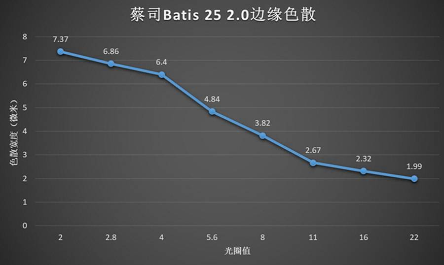 相对于同门同宗的Batis 85 1.8来说,这样的色散控制水平只能说是凑合。当然广角镜头本身就比较难以全面压制色散,这种表现,其实也说得过去了。
