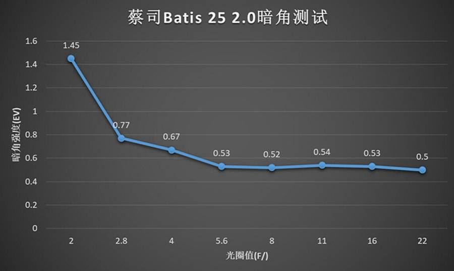 全开光圈暗角1.45EVs,收一档光圈即可获得比较好的控制。