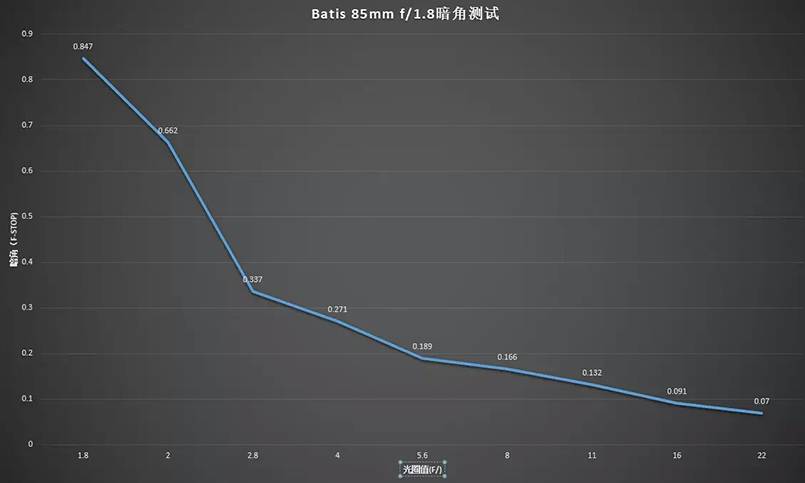 最大暗角大约0.85档,属于正常水准。光圈收到2.8之后暗角即可得到比较好的控制