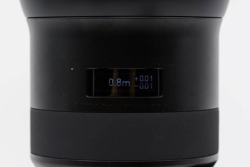 OLED屏幕效果。中间是对焦距离,右上和右下是景深尺。图中意思为景深范围是0.799-0.801m。
